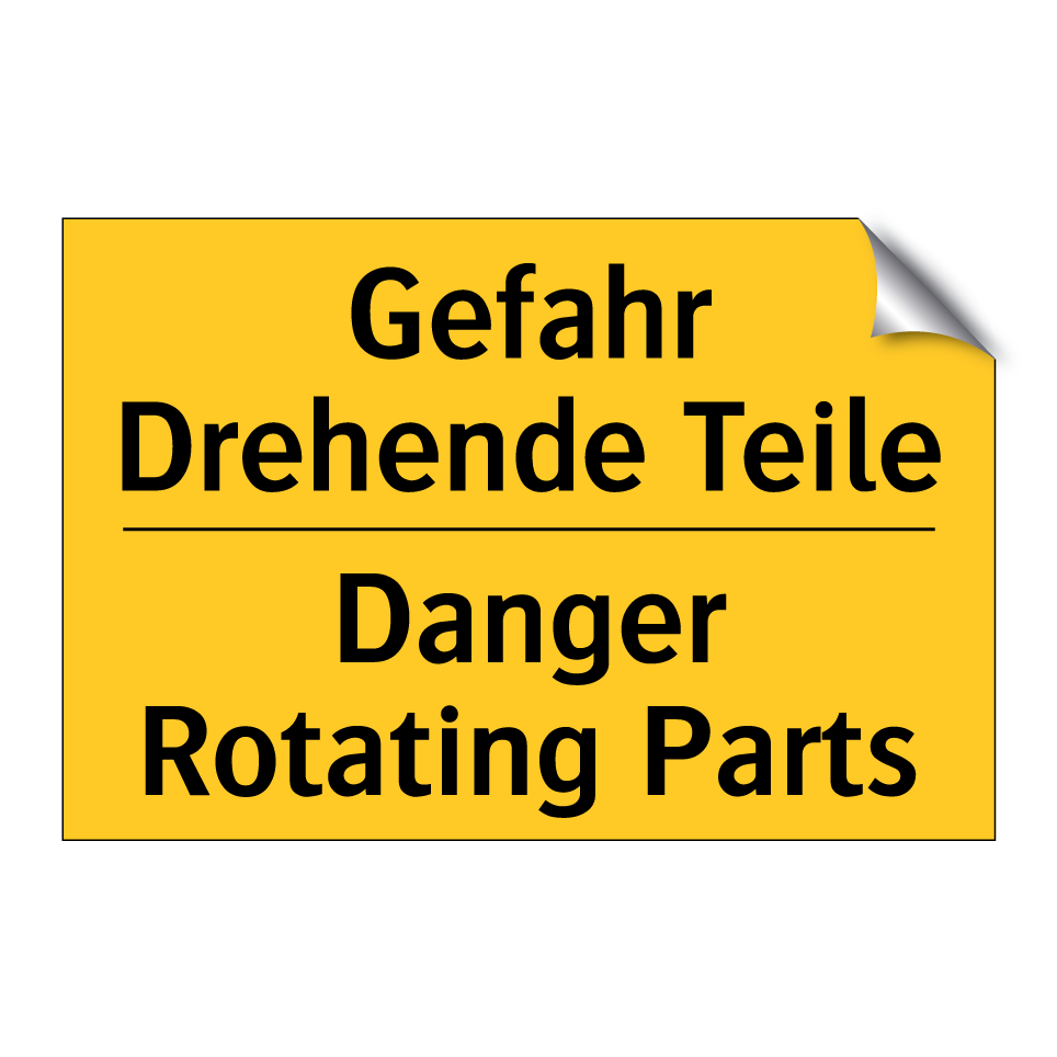 Zweisprachiges Warnschild mit deutschem Text Gefahr Drehende Teile und englischem Text Danger Rotating Parts