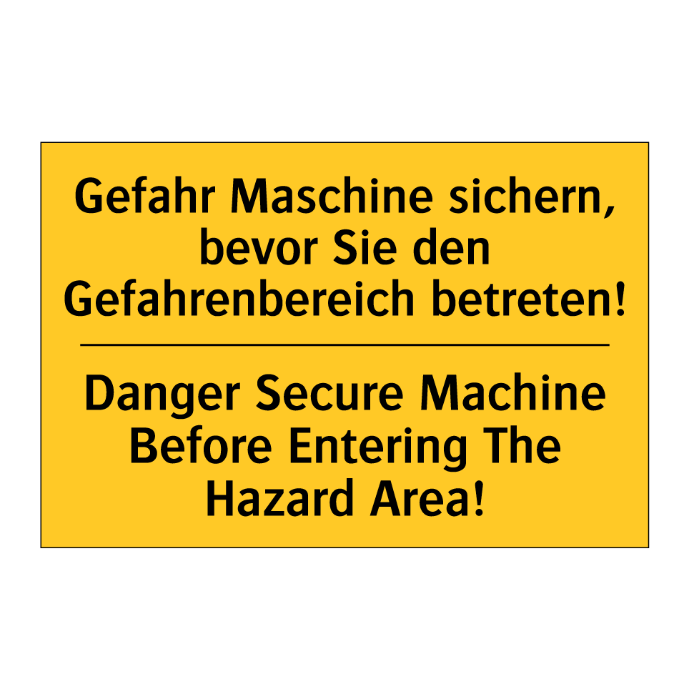 Zweisprachiges Warnschild mit deutschem Text Gefahr Maschine sichern, bevor Sie den Gefahrenbereich betreten! und englischem Text Danger Secure Machine Before Entering The Hazard Area!