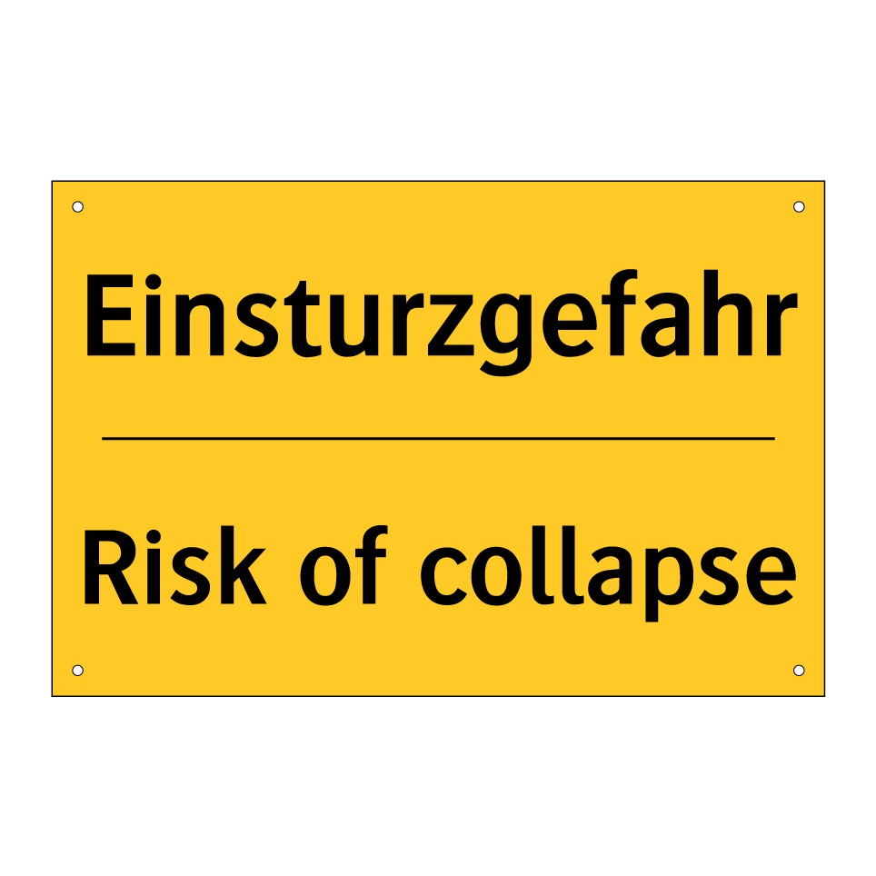 Zweisprachiges Warnschild mit deutschem Text Einsturzgefahr und englischem Text Risk of collapse