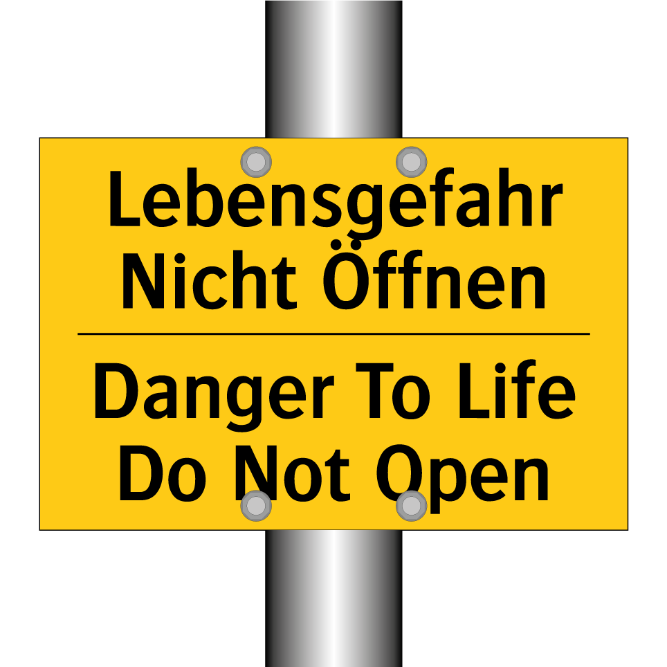 Zweisprachiges Warnschild mit deutschem Text Lebensgefahr Nicht Öffnen und englischem Text Danger To Life Do Not Open