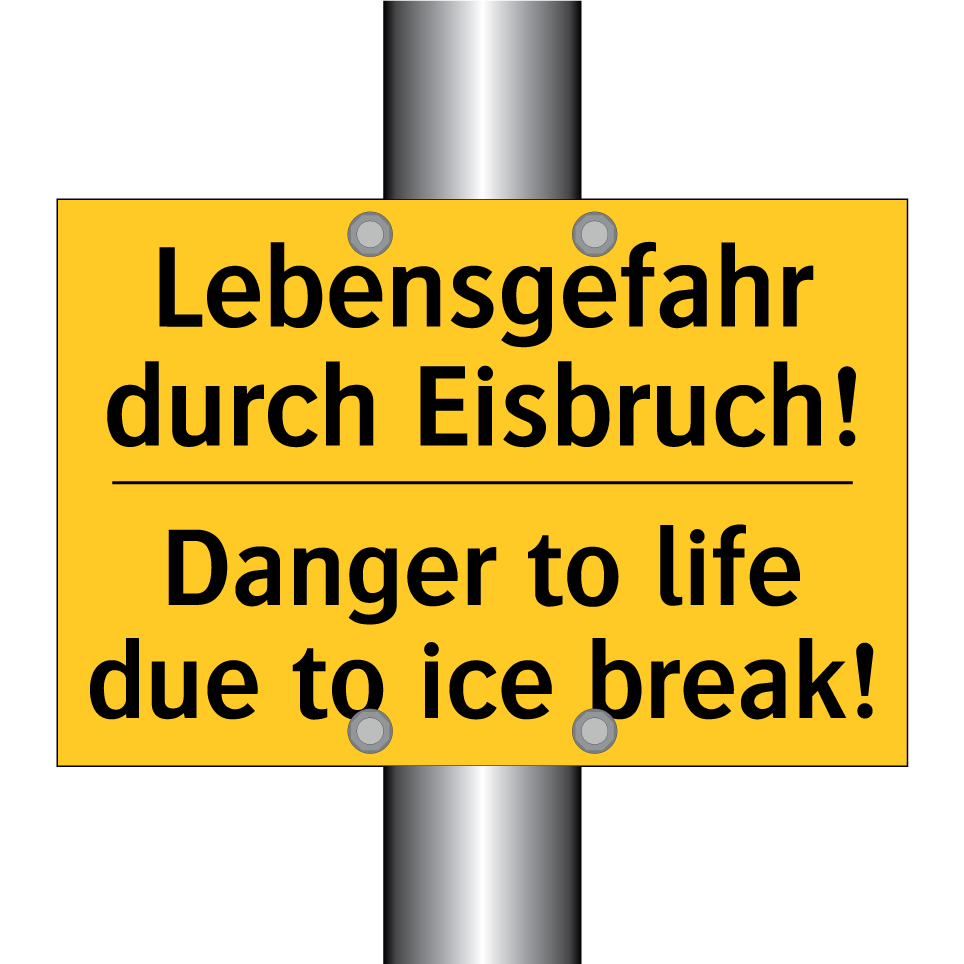 Zweisprachiges Warnschild mit deutschem Text Lebensgefahr durch Eisbruch! und englischem Text Danger to life due to ice break!