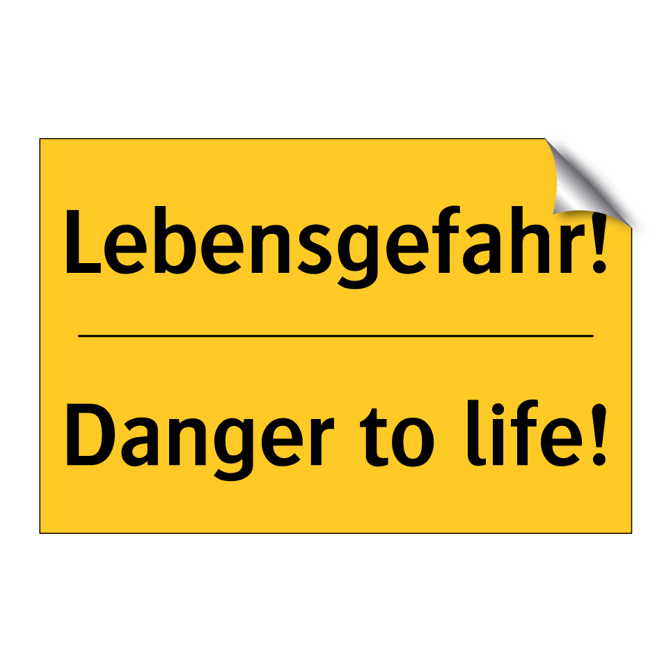 Zweisprachiges Warnschild mit deutschem Text Lebensgefahr! und englischem Text Danger to life!