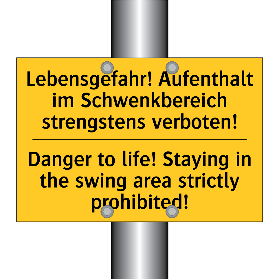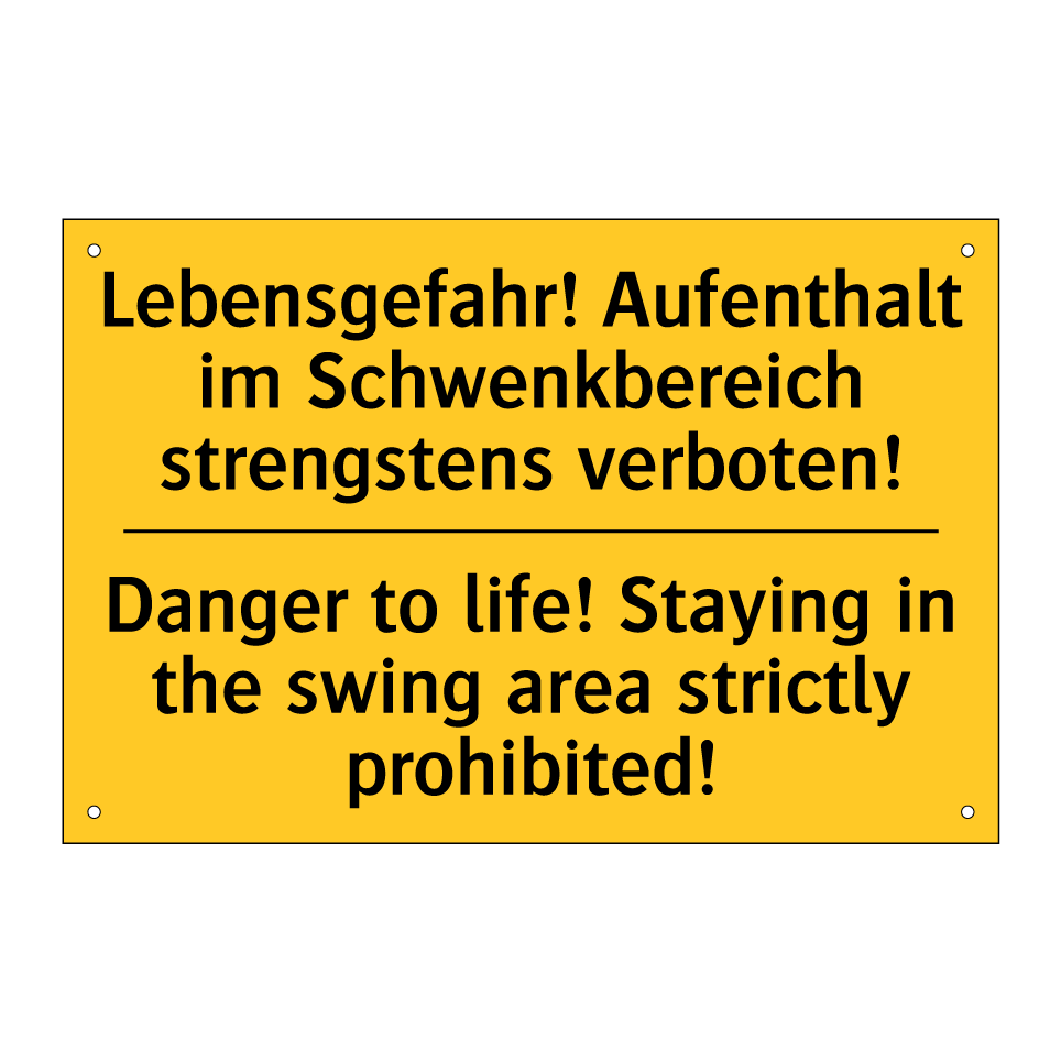 Zweisprachiges Warnschild mit deutschem Text Lebensgefahr! Aufenthalt im Schwenkbereich strengstens verboten! und englischem Text Danger to life! Staying in the swing area strictly prohibited!