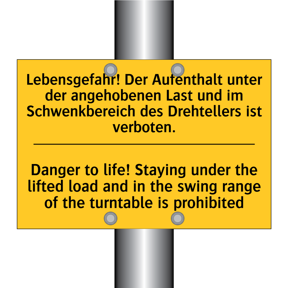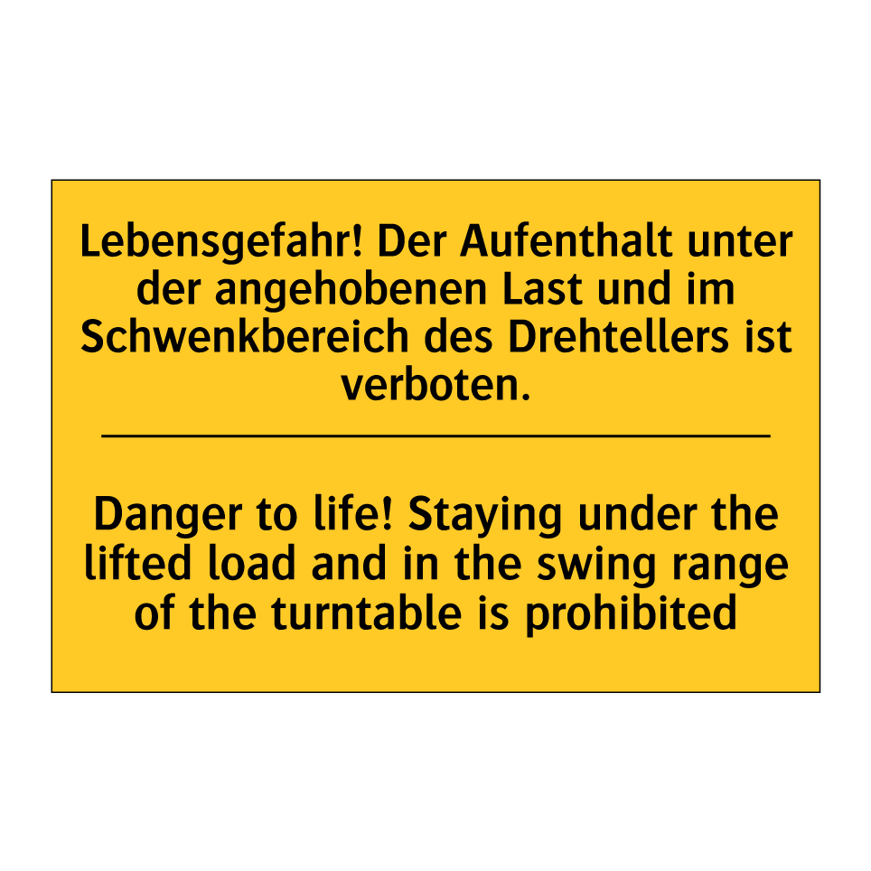 Zweisprachiges Warnschild mit deutschem Text Lebensgefahr! Der Aufenthalt unter der angehobenen Last und im Schwenkbereich des Drehtellers ist verboten. und englischem Text Danger to life! Staying under the lifted load and in the swing range of the turntable is prohibited