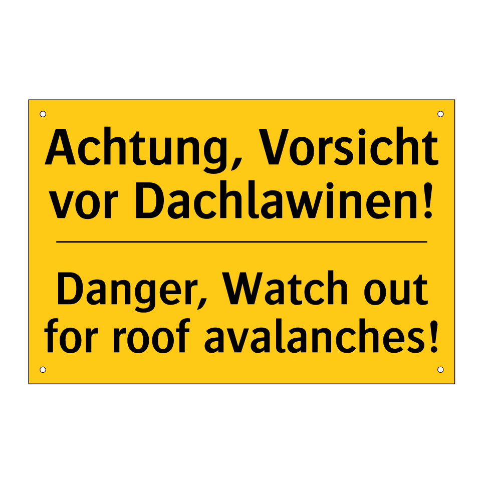 Zweisprachiges Warnschild mit deutschem Text Achtung, Vorsicht vor Dachlawinen! und englischem Text Danger, Watch out for roof avalanches!