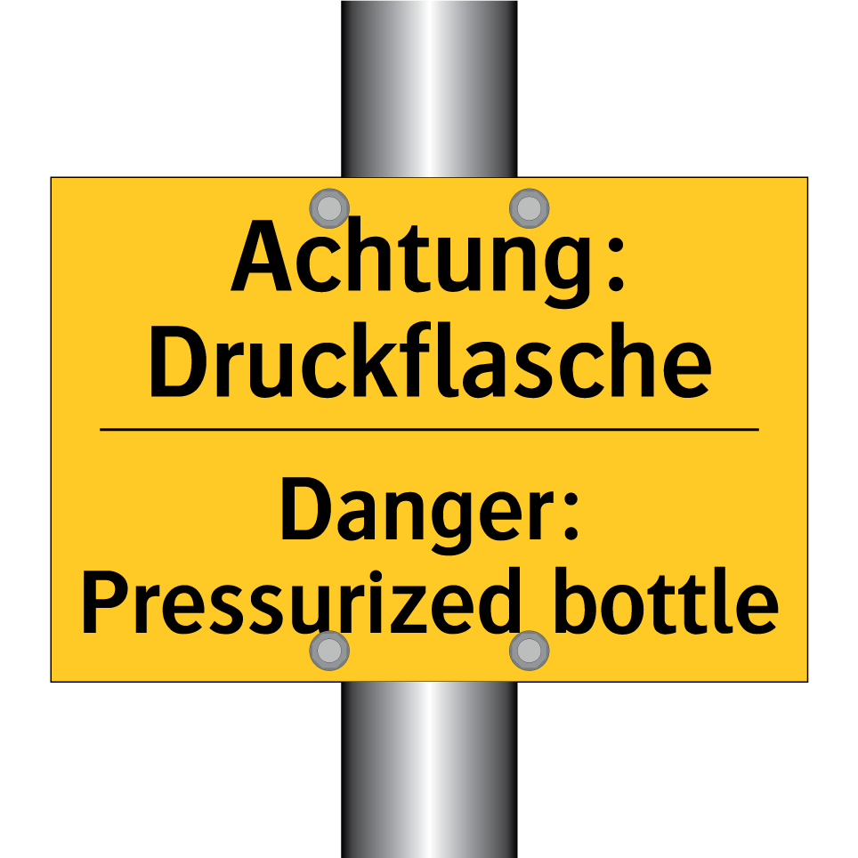 Zweisprachiges Warnschild mit deutschem Text Achtung: Druckflasche und englischem Text Danger: Pressurized bottle