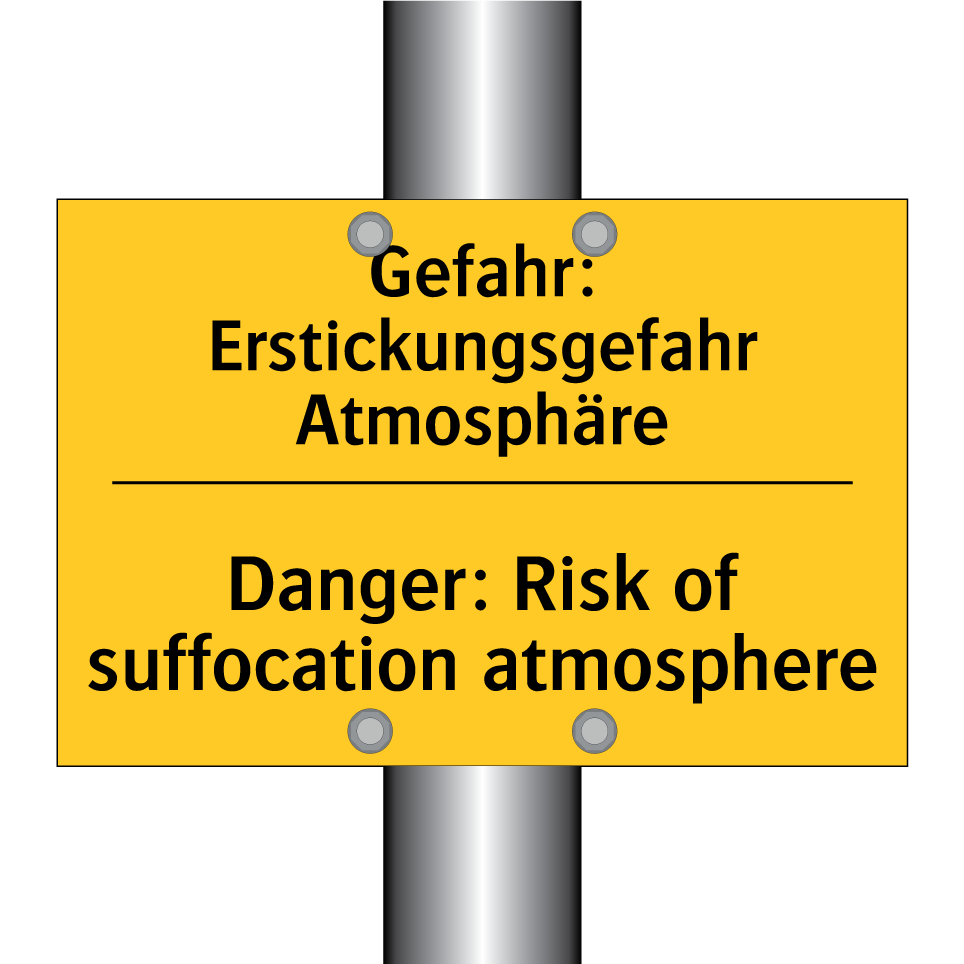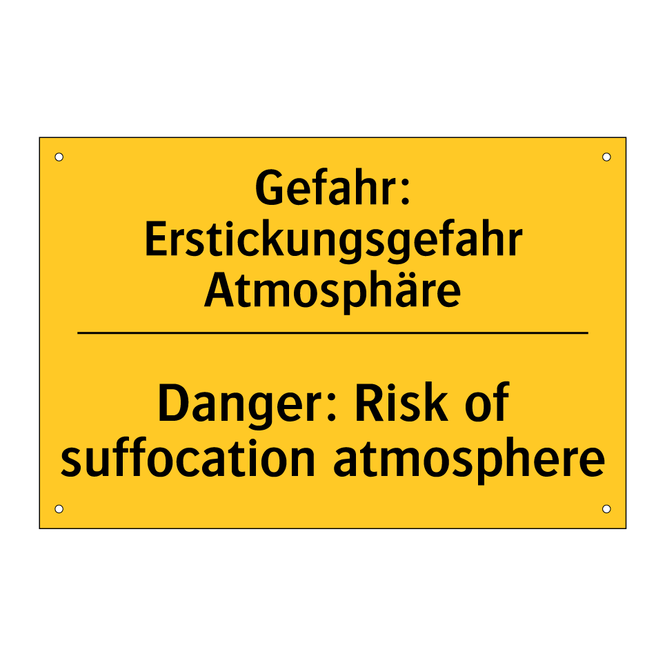 Zweisprachiges Warnschild mit deutschem Text Gefahr: Erstickungsgefahr Atmosphäre und englischem Text Danger: Risk of suffocation atmosphere