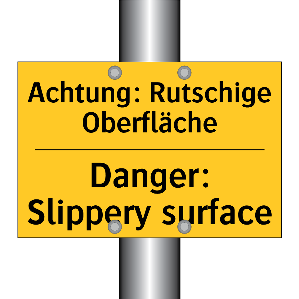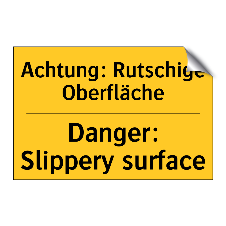 Zweisprachiges Warnschild mit deutschem Text Achtung: Rutschige Oberfläche und englischem Text Danger: Slippery surface