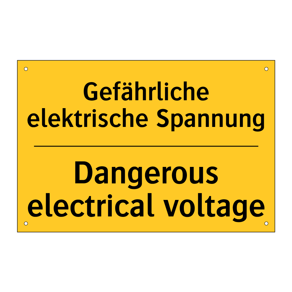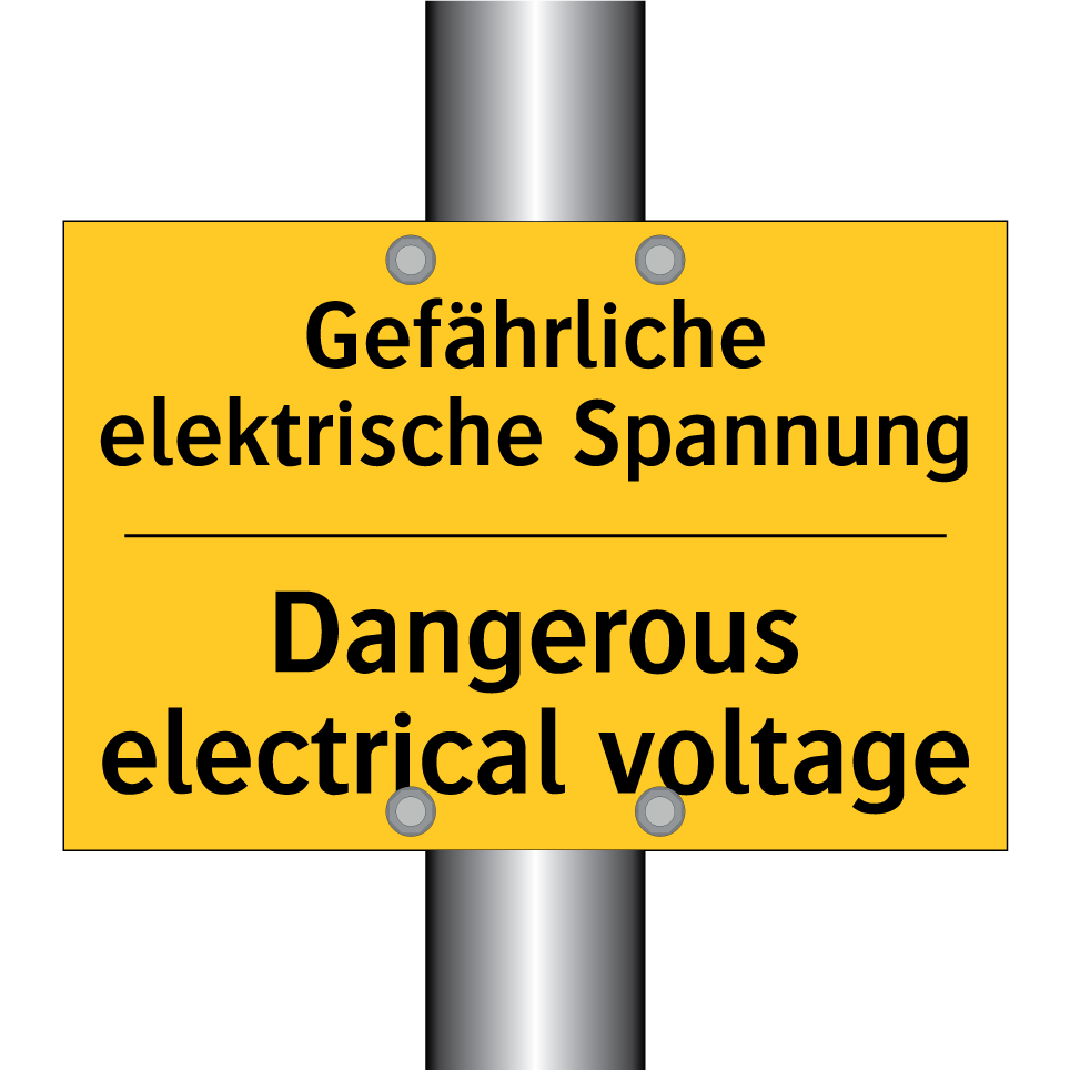 Zweisprachiges Warnschild mit deutschem Text Gefährliche elektrische Spannung und englischem Text Dangerous electrical voltage