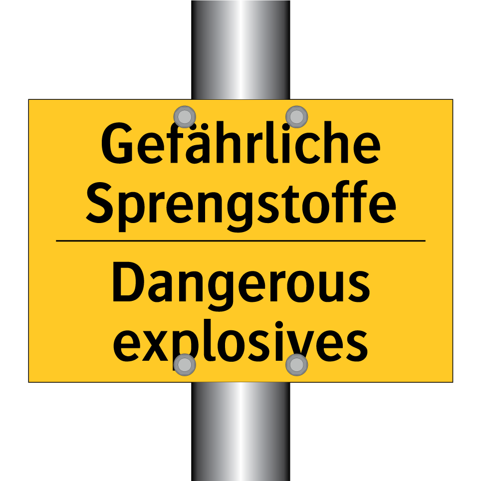 Zweisprachiges Warnschild mit deutschem Text Gefährliche Sprengstoffe und englischem Text Dangerous explosives