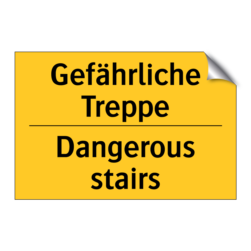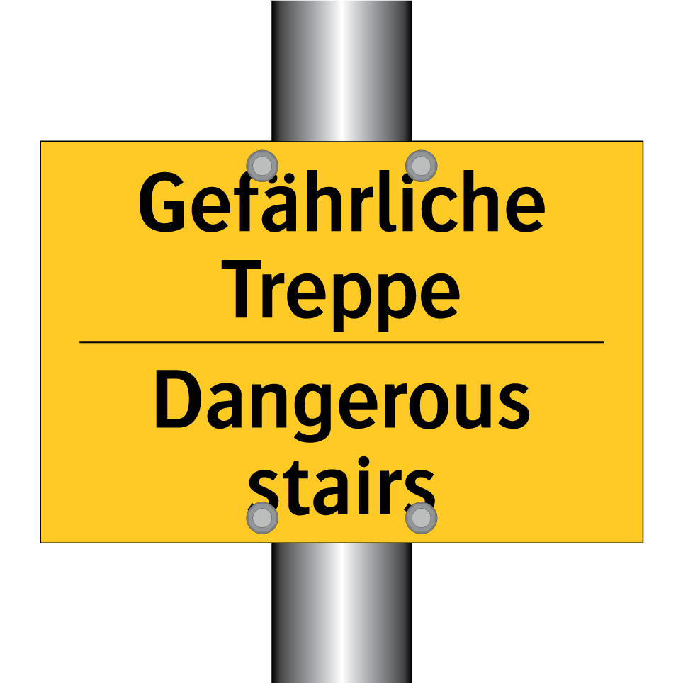 Zweisprachiges Warnschild mit deutschem Text Gefährliche Treppe und englischem Text Dangerous stairs