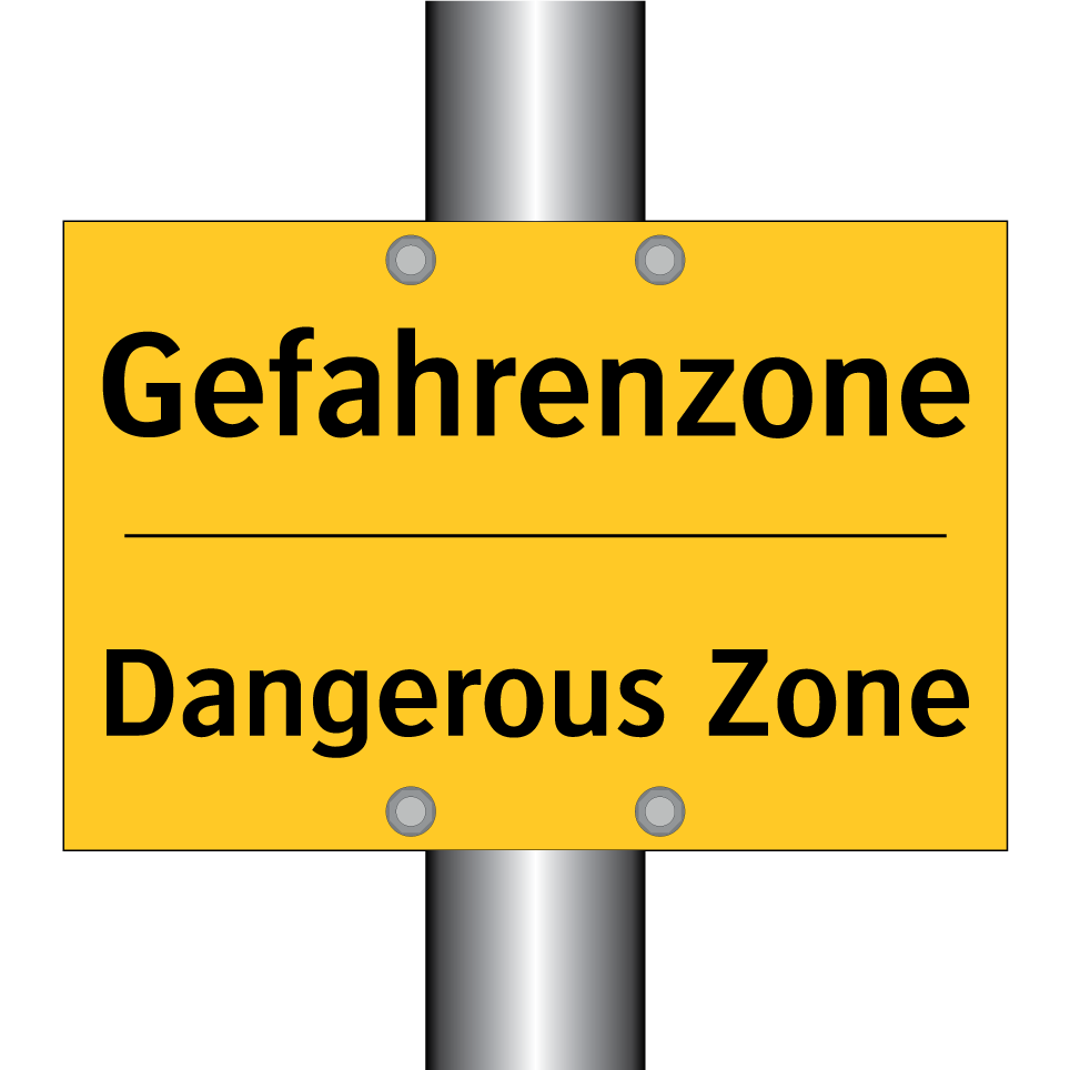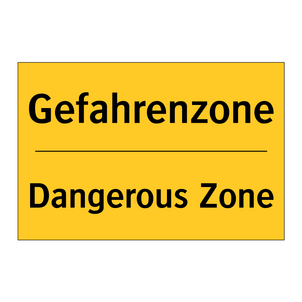 Zweisprachiges Warnschild mit deutschem Text Gefahrenzone und englischem Text Dangerous Zone