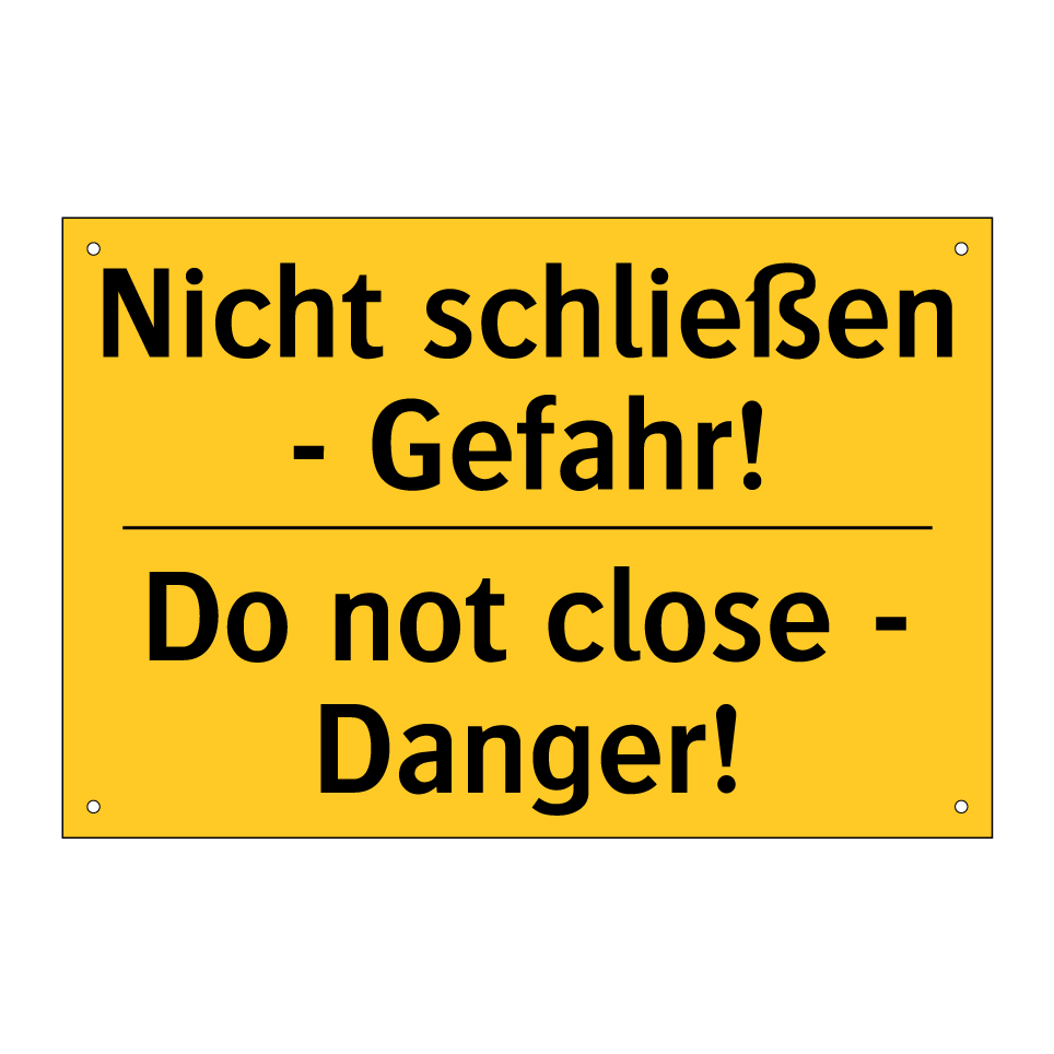 Zweisprachiges Warnschild mit deutschem Text Nicht schließen - Gefahr! und englischem Text Do not close - Danger!