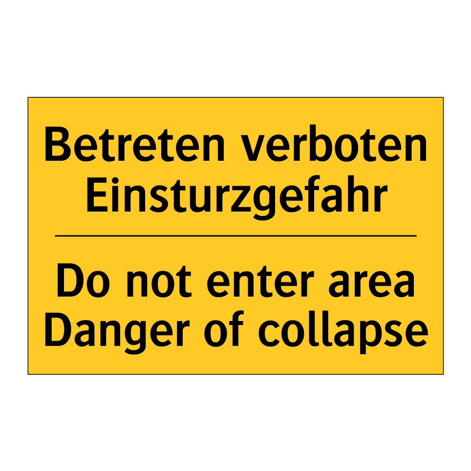 Zweisprachiges Warnschild mit deutschem Text Betreten verboten Einsturzgefahr und englischem Text Do not enter area Danger of collapse
