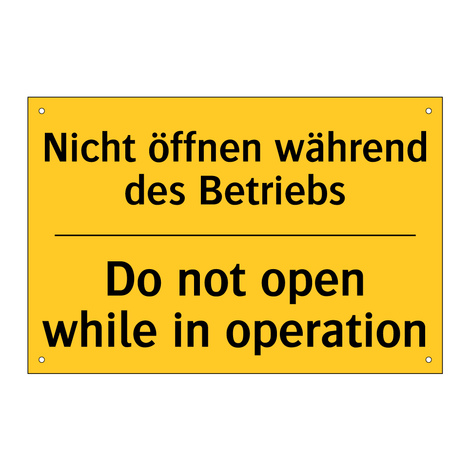 Zweisprachiges Warnschild mit deutschem Text Nicht öffnen während des Betriebs und englischem Text Do not open while in operation