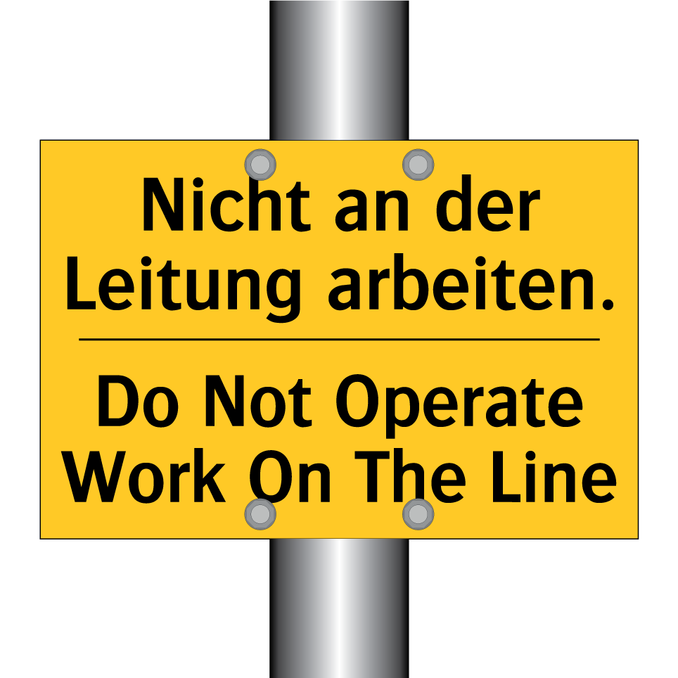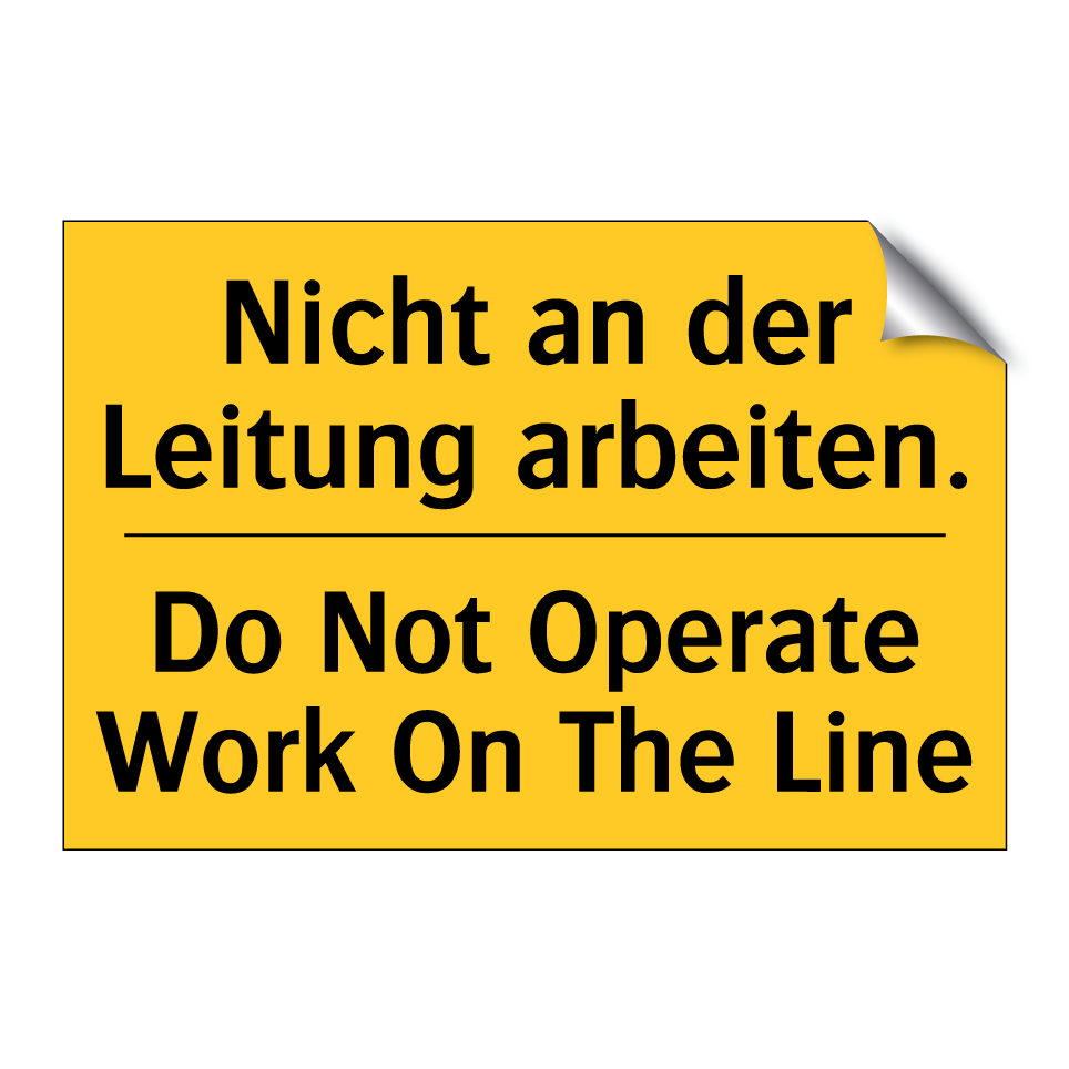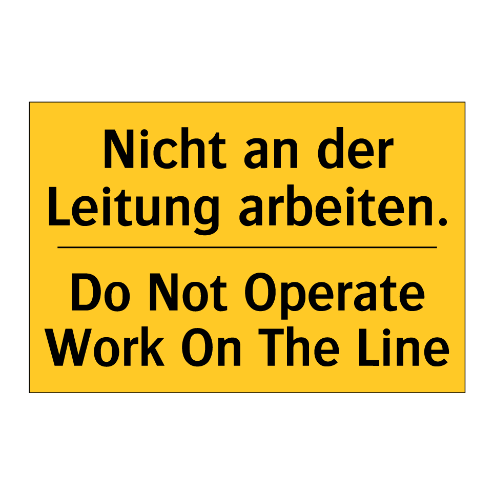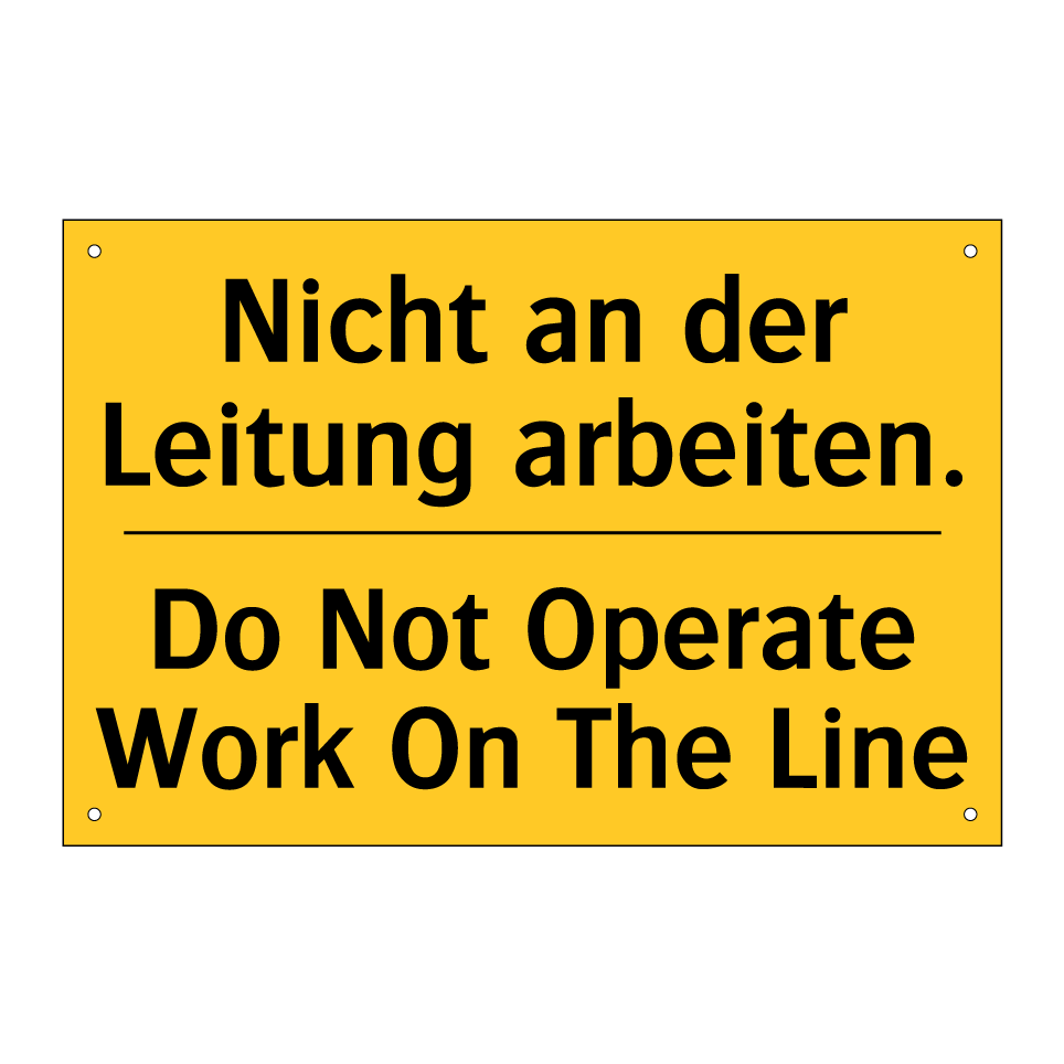 Zweisprachiges Warnschild mit deutschem Text Nicht an der Leitung arbeiten. und englischem Text Do Not Operate Work On The Line