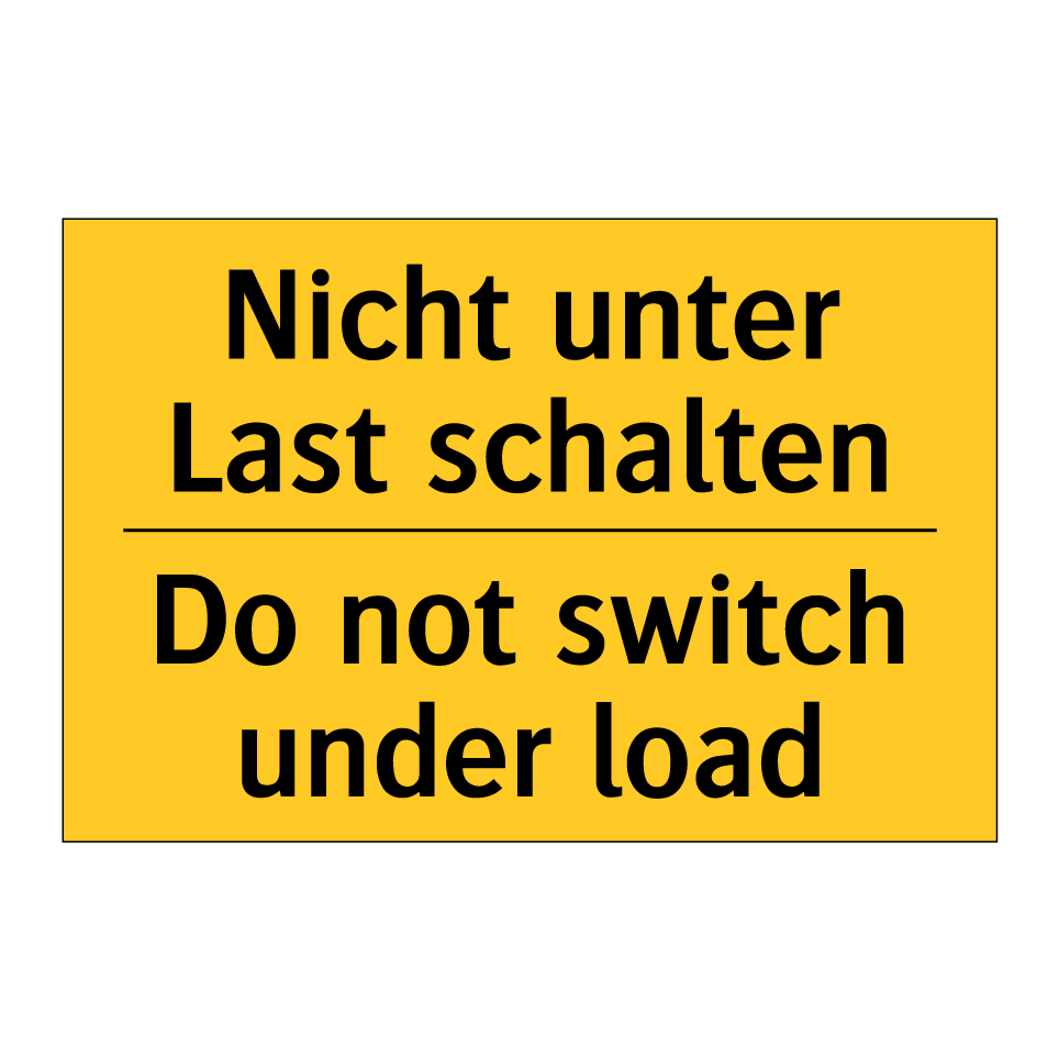 Zweisprachiges Warnschild mit deutschem Text Nicht unter Last schalten und englischem Text Do not switch under load