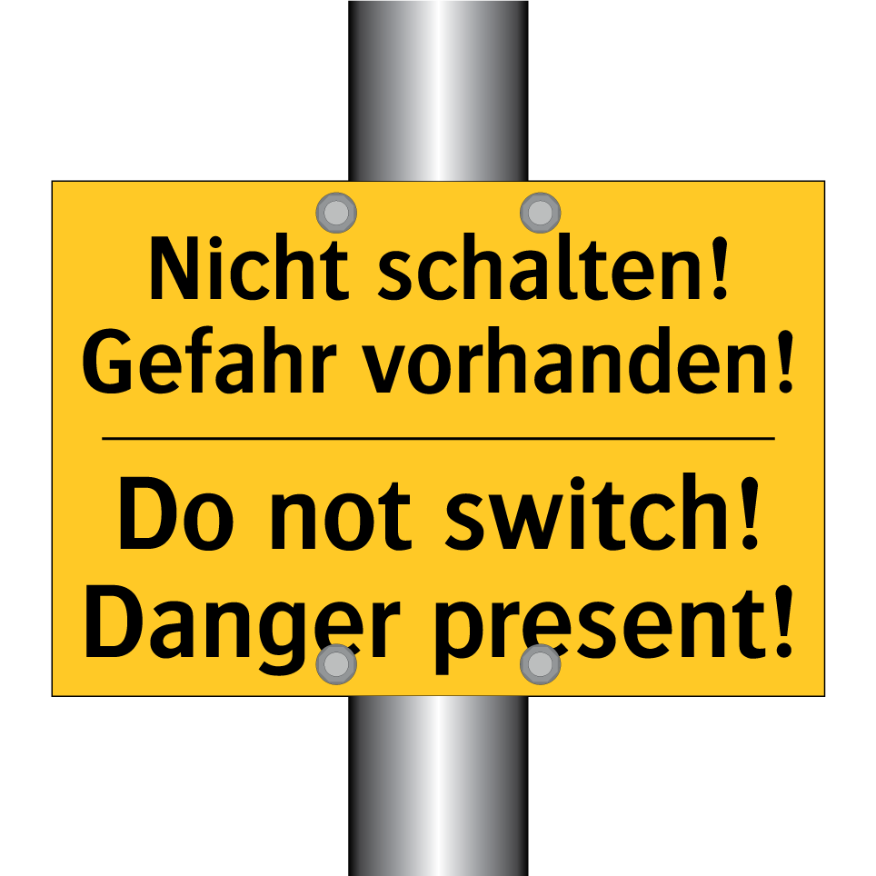 Zweisprachiges Warnschild mit deutschem Text Nicht schalten! Gefahr vorhanden! und englischem Text Do not switch! Danger present!