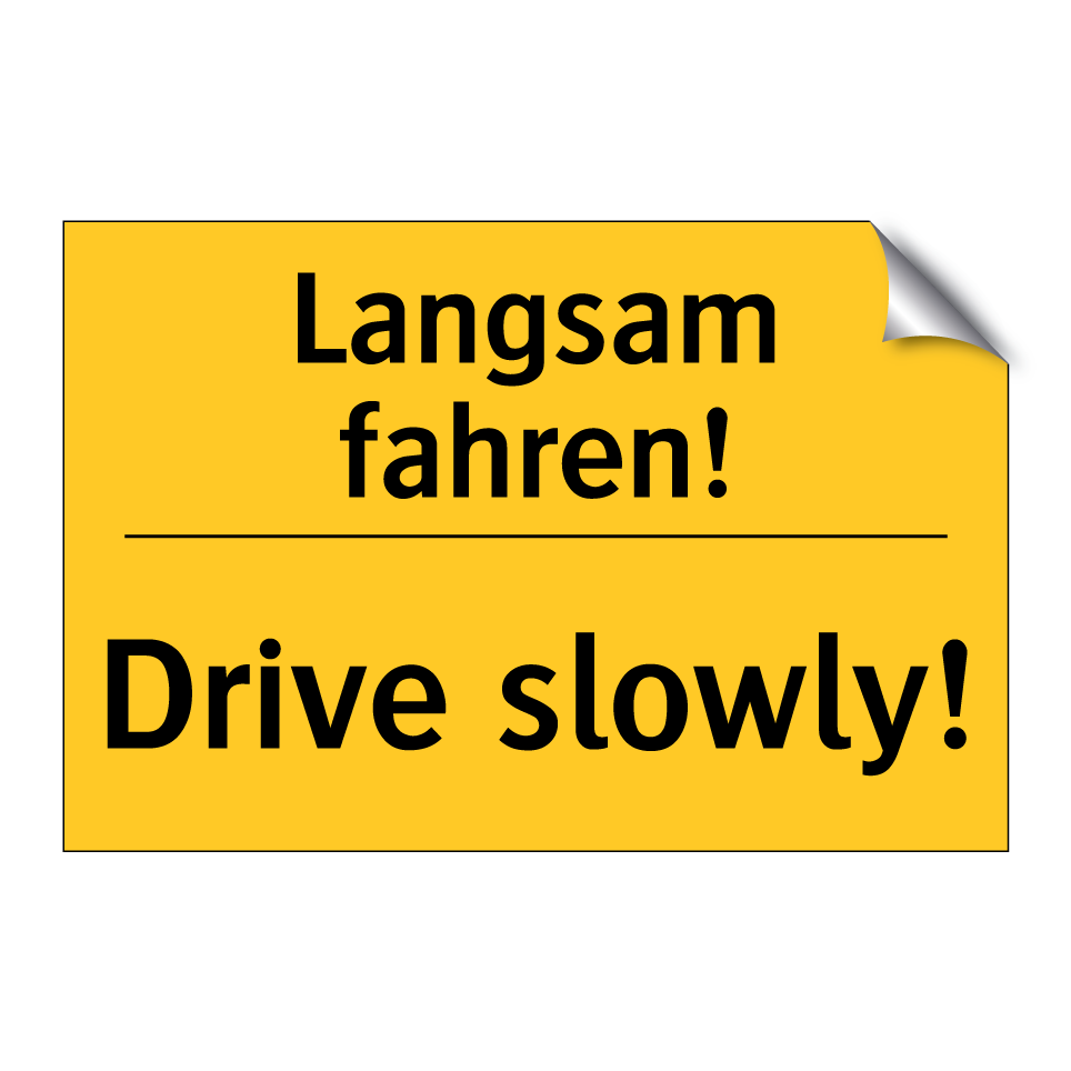 Zweisprachiges Warnschild mit deutschem Text Langsam fahren! und englischem Text Drive slowly!