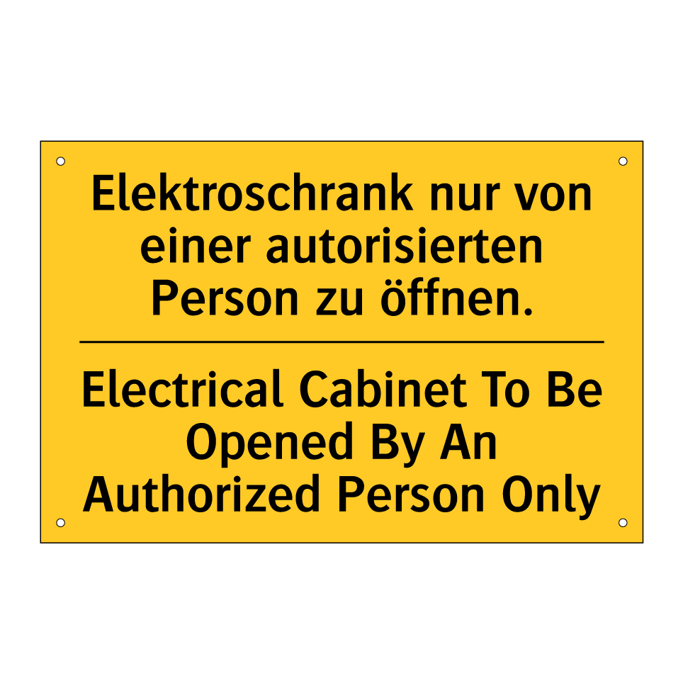Zweisprachiges Warnschild mit deutschem Text Elektroschrank nur von einer autorisierten Person zu öffnen. und englischem Text Electrical Cabinet To Be Opened By An Authorized Person Only
