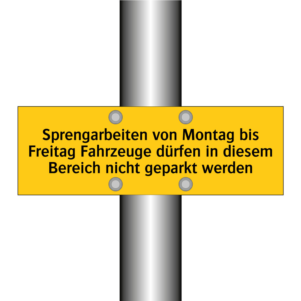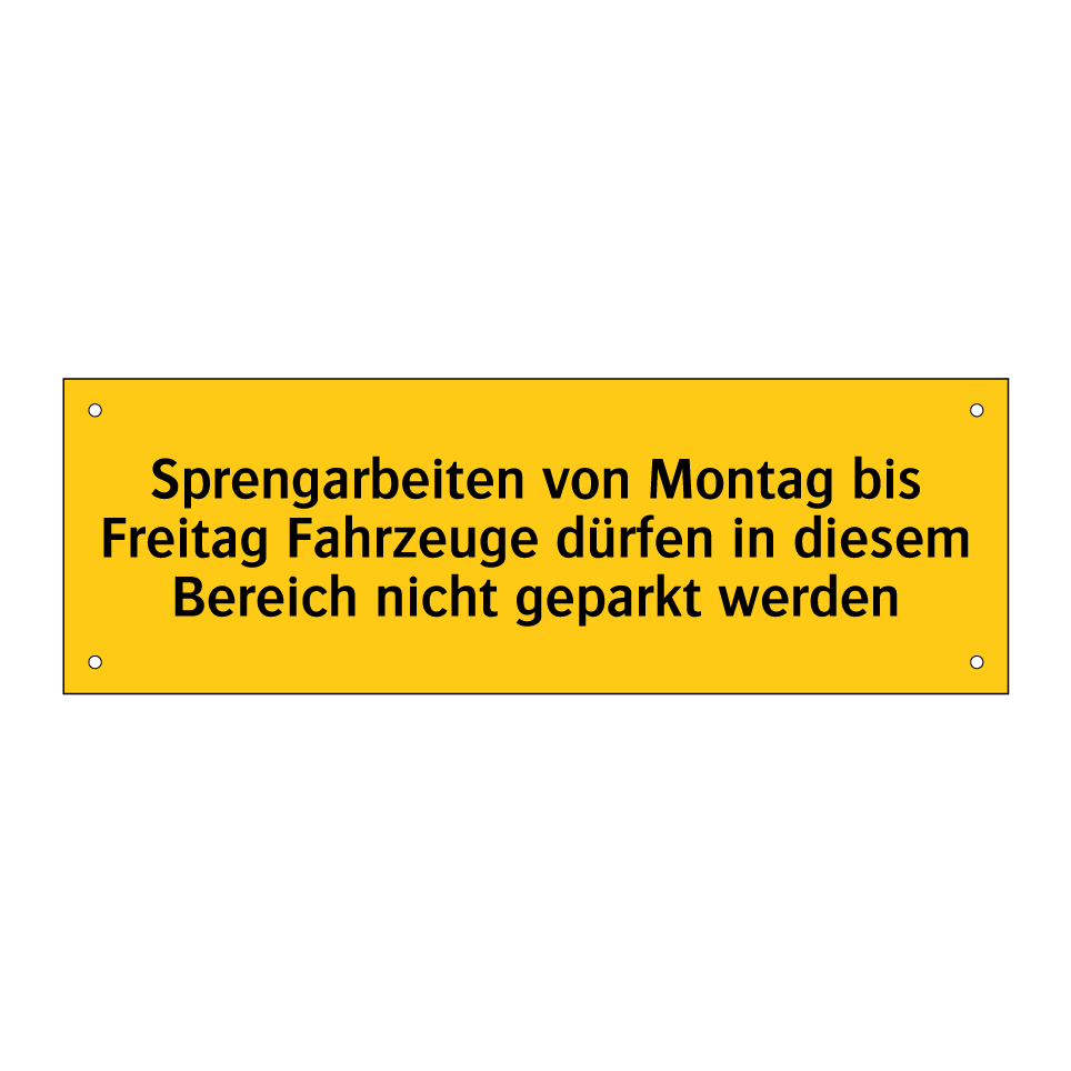Warnschild mit dem Text Sprengarbeiten von Montag bis Freitag Fahrzeuge dürfen in diesem Bereich nicht geparkt werden