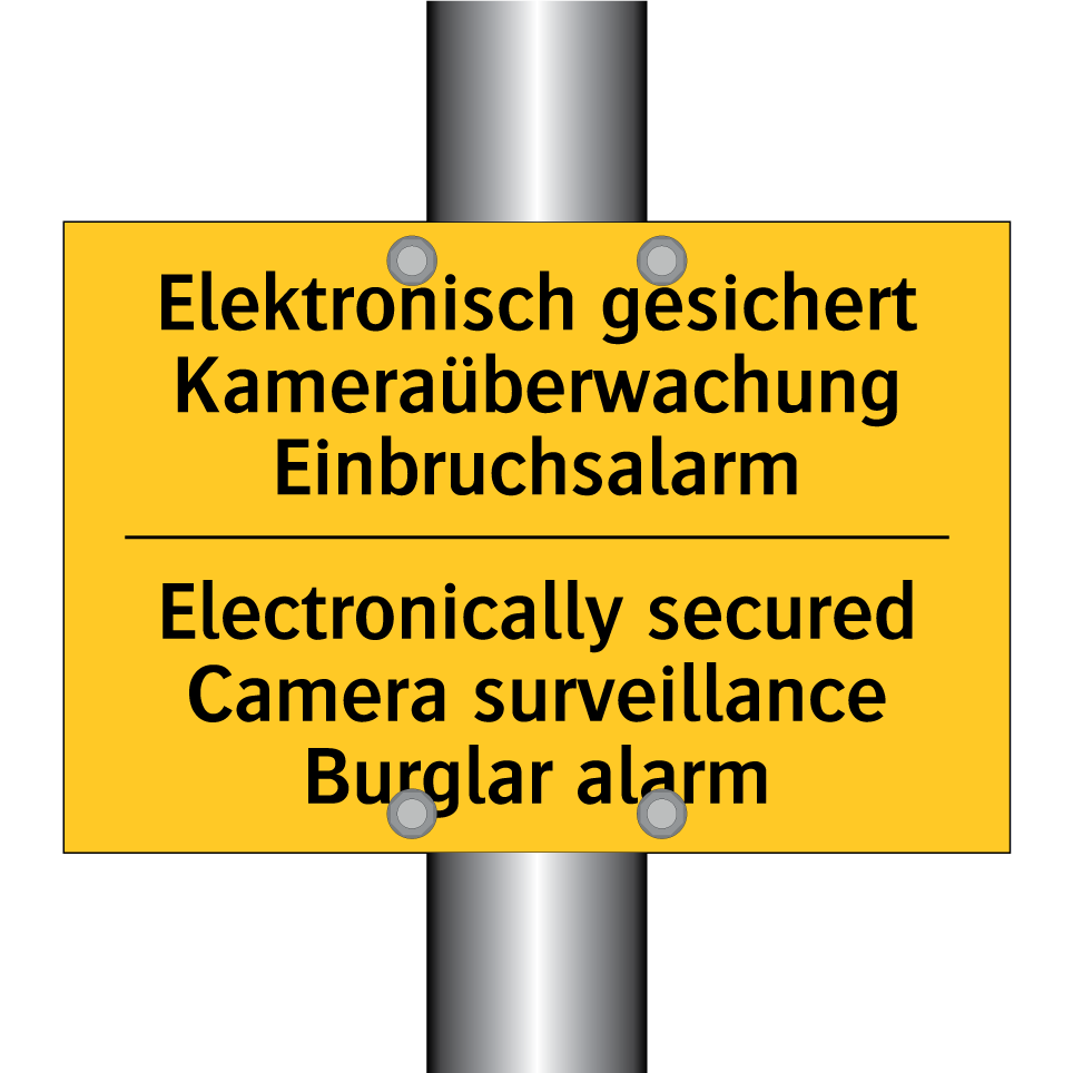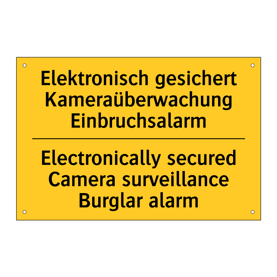 Zweisprachiges Warnschild mit deutschem Text Elektronisch gesichert Kameraüberwachung Einbruchsalarm und englischem Text Electronically secured Camera surveillance Burglar alarm