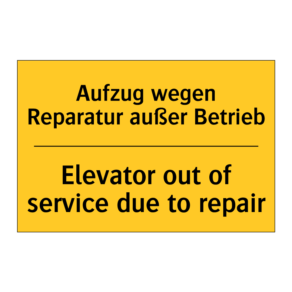 Zweisprachiges Warnschild mit deutschem Text Aufzug wegen Reparatur außer Betrieb und englischem Text Elevator out of service due to repair