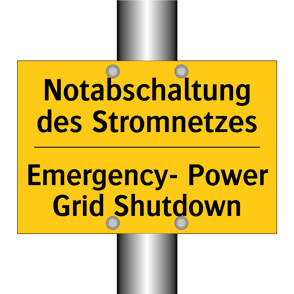 Zweisprachiges Warnschild mit deutschem Text Notabschaltung des Stromnetzes und englischem Text Emergency- Power Grid Shutdown