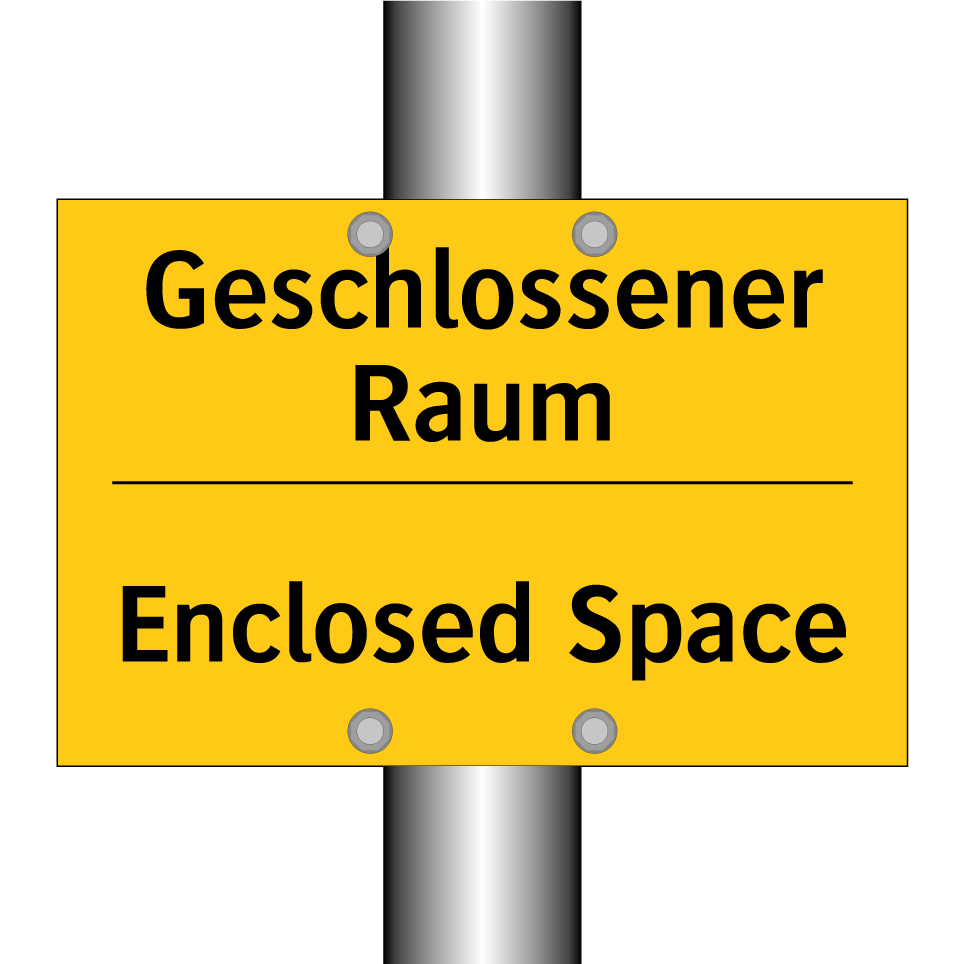 Zweisprachiges Warnschild mit deutschem Text Geschlossener Raum und englischem Text Enclosed Space