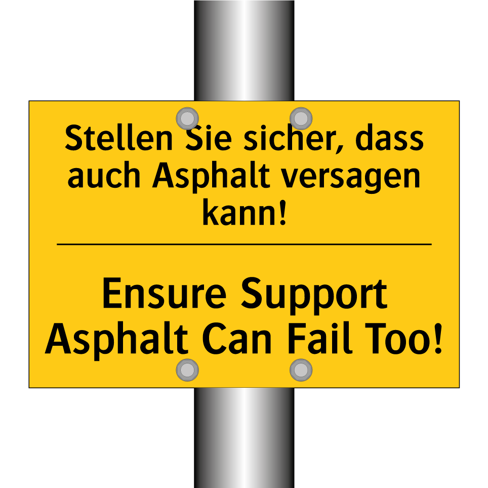 Zweisprachiges Warnschild mit deutschem Text Stellen Sie sicher, dass auch Asphalt versagen kann! und englischem Text Ensure Support Asphalt Can Fail Too!