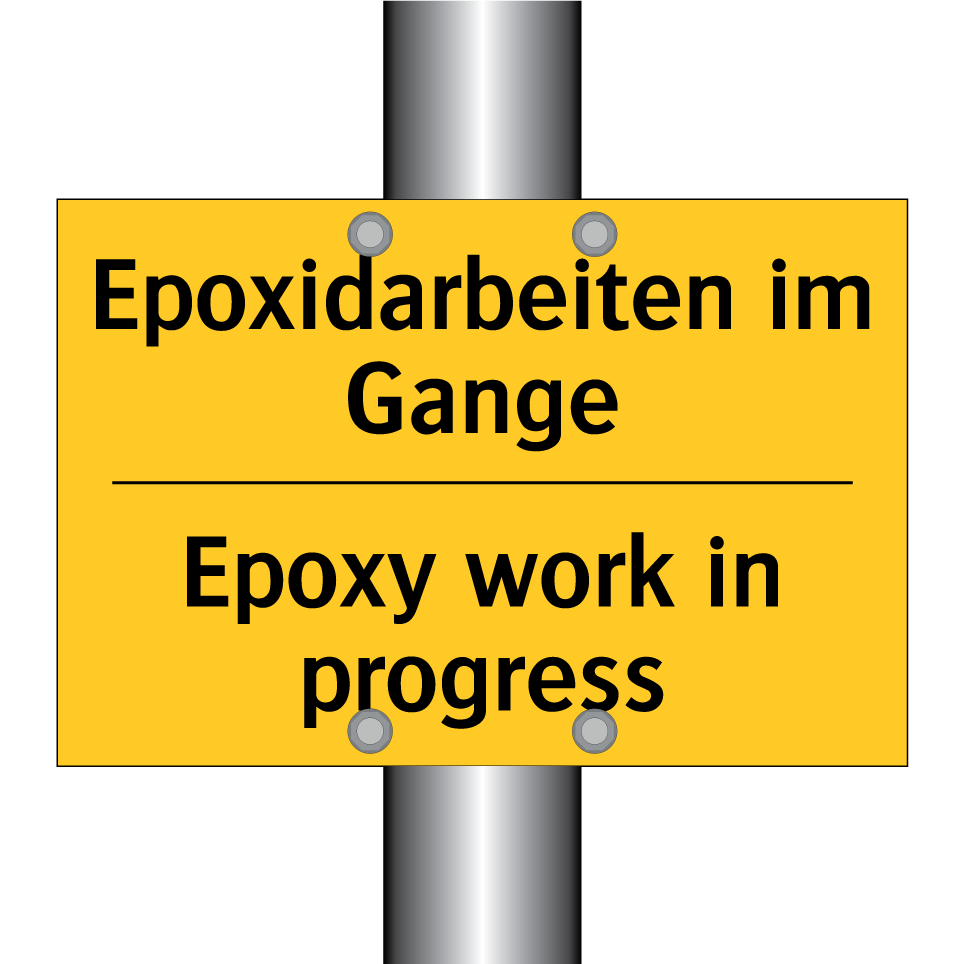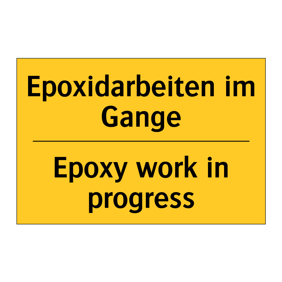 Zweisprachiges Warnschild mit deutschem Text Epoxidarbeiten im Gange und englischem Text Epoxy work in progress