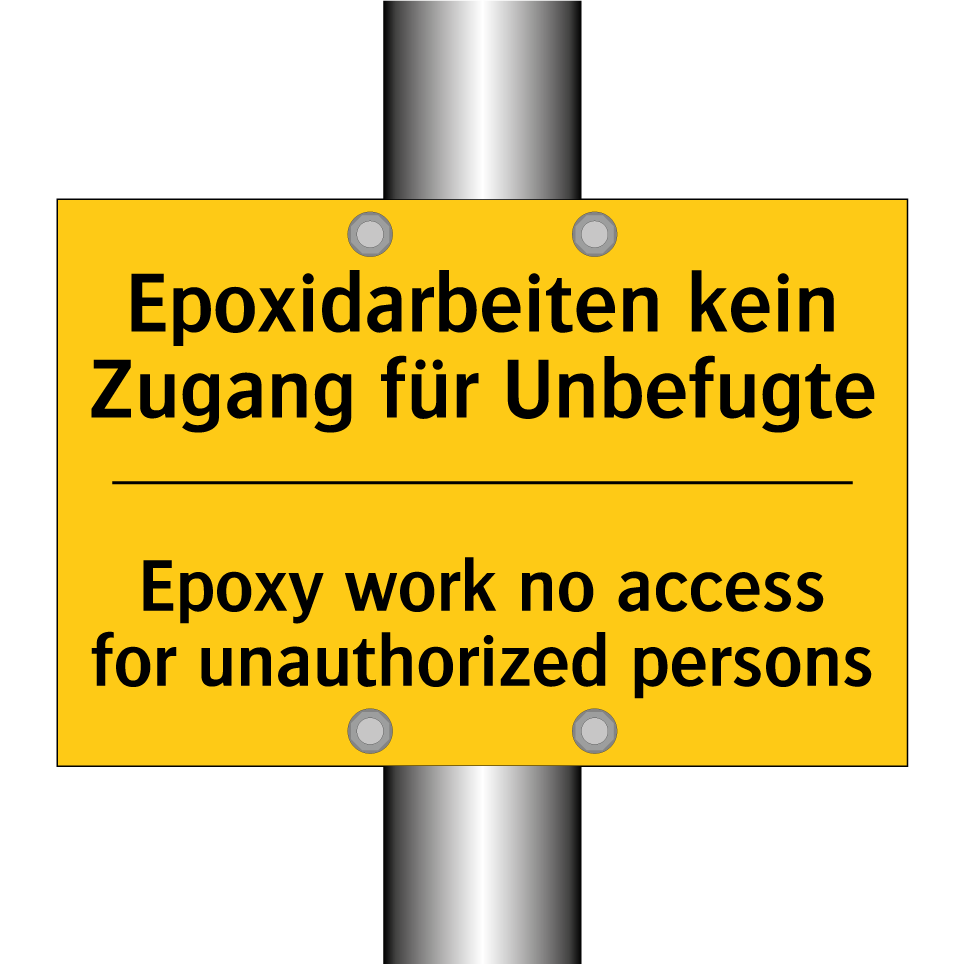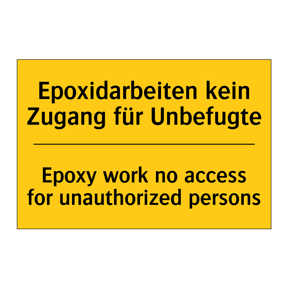 Zweisprachiges Warnschild mit deutschem Text Epoxidarbeiten kein Zugang für Unbefugte und englischem Text Epoxy work no access for unauthorized persons