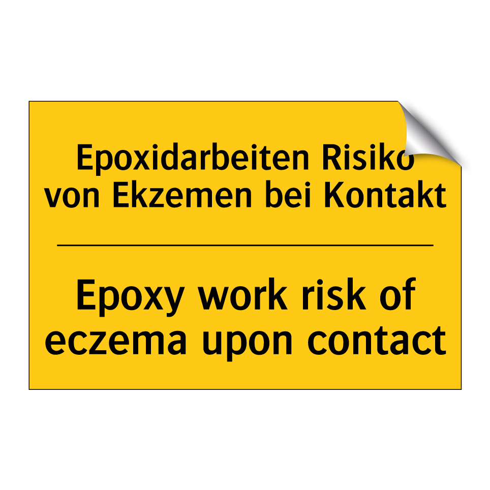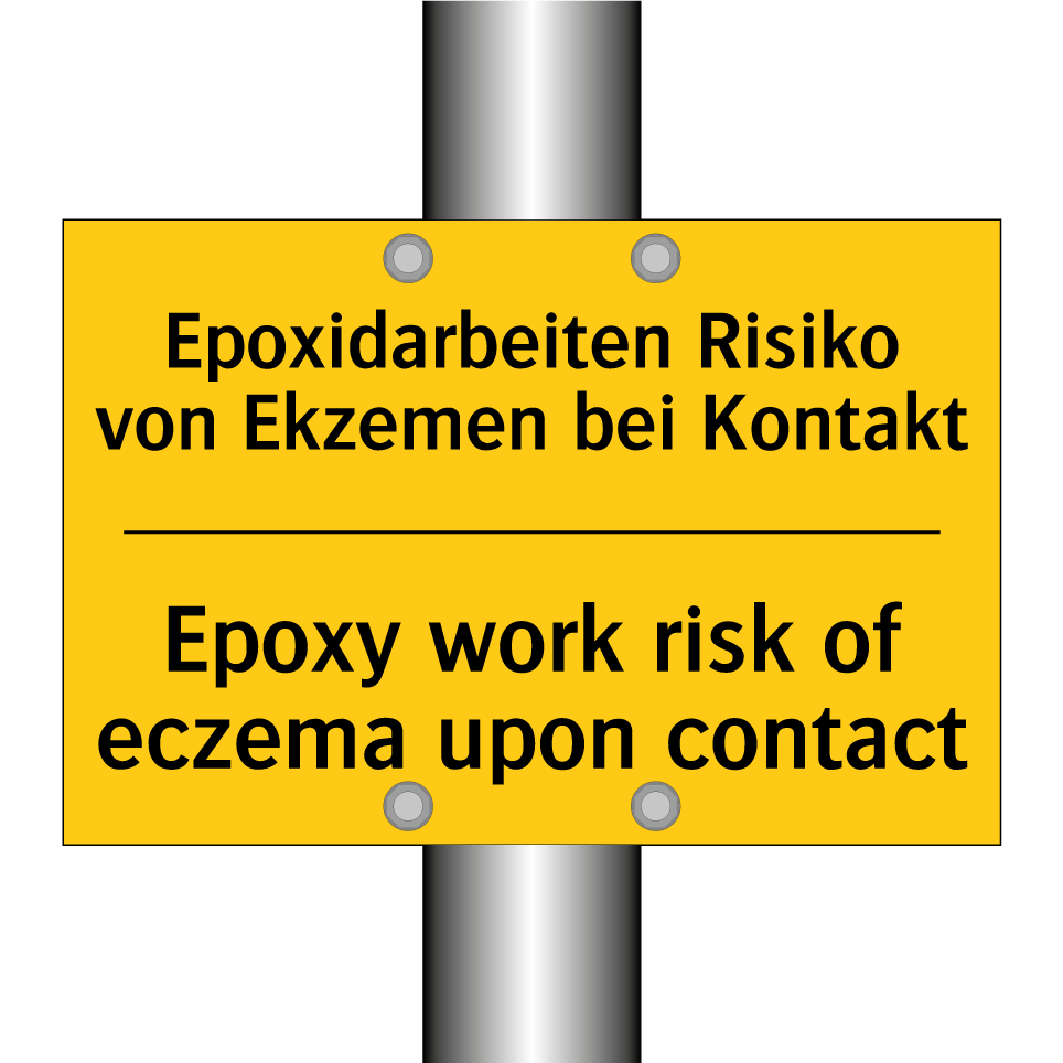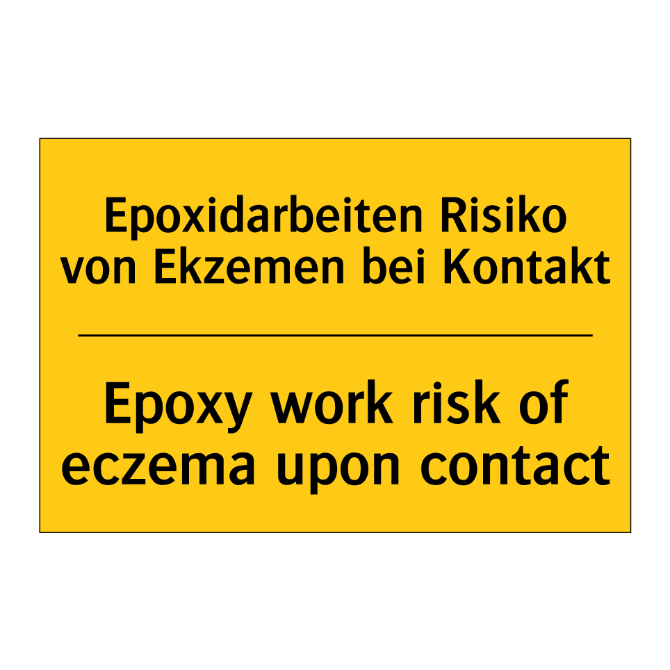 Zweisprachiges Warnschild mit deutschem Text Epoxidarbeiten Risiko von Ekzemen bei Kontakt und englischem Text Epoxy work risk of eczema upon contact