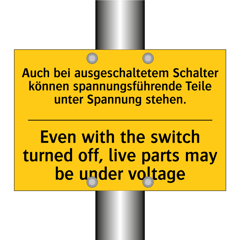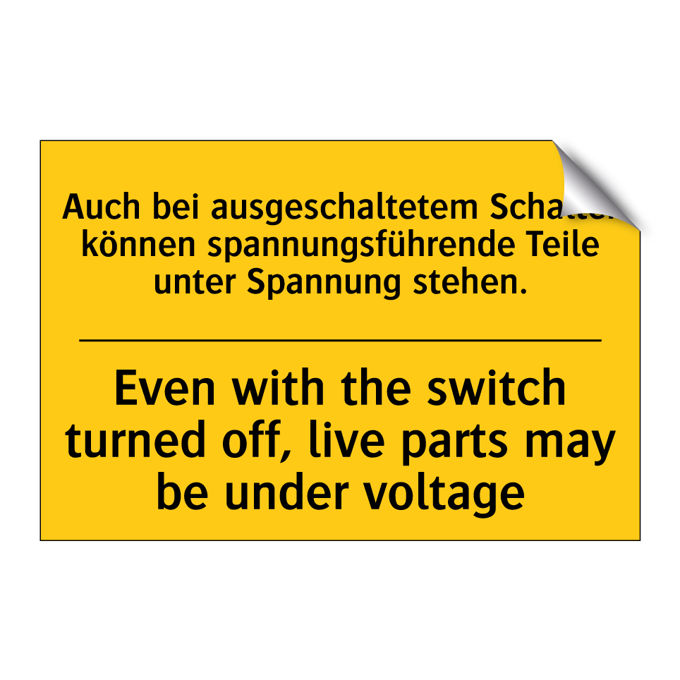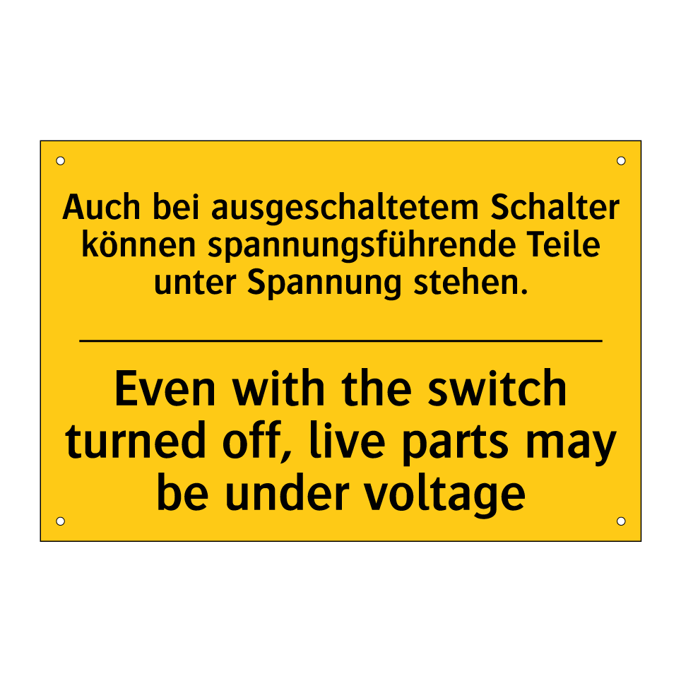 Zweisprachiges Warnschild mit deutschem Text Auch bei ausgeschaltetem Schalter können spannungsführende Teile unter Spannung stehen. und englischem Text Even with the switch turned off, live parts may be under voltage