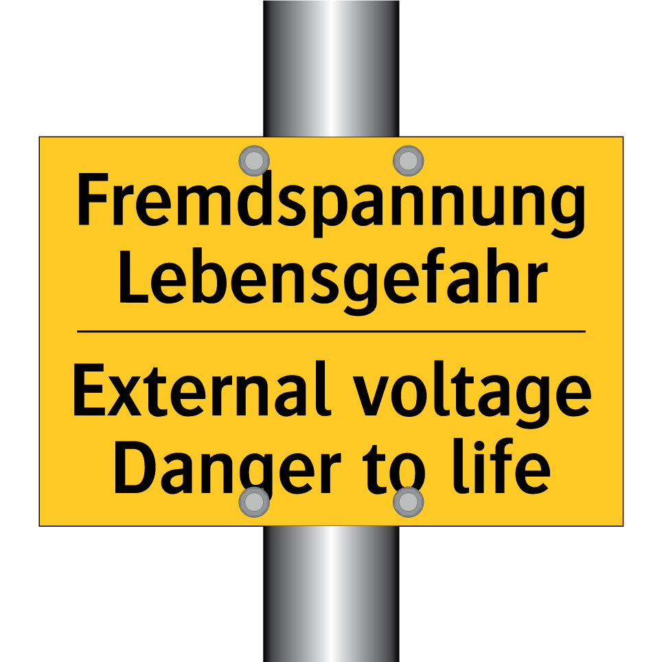 Zweisprachiges Warnschild mit deutschem Text Fremdspannung Lebensgefahr und englischem Text External voltage Danger to life