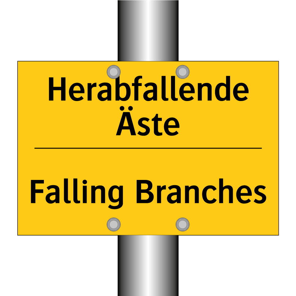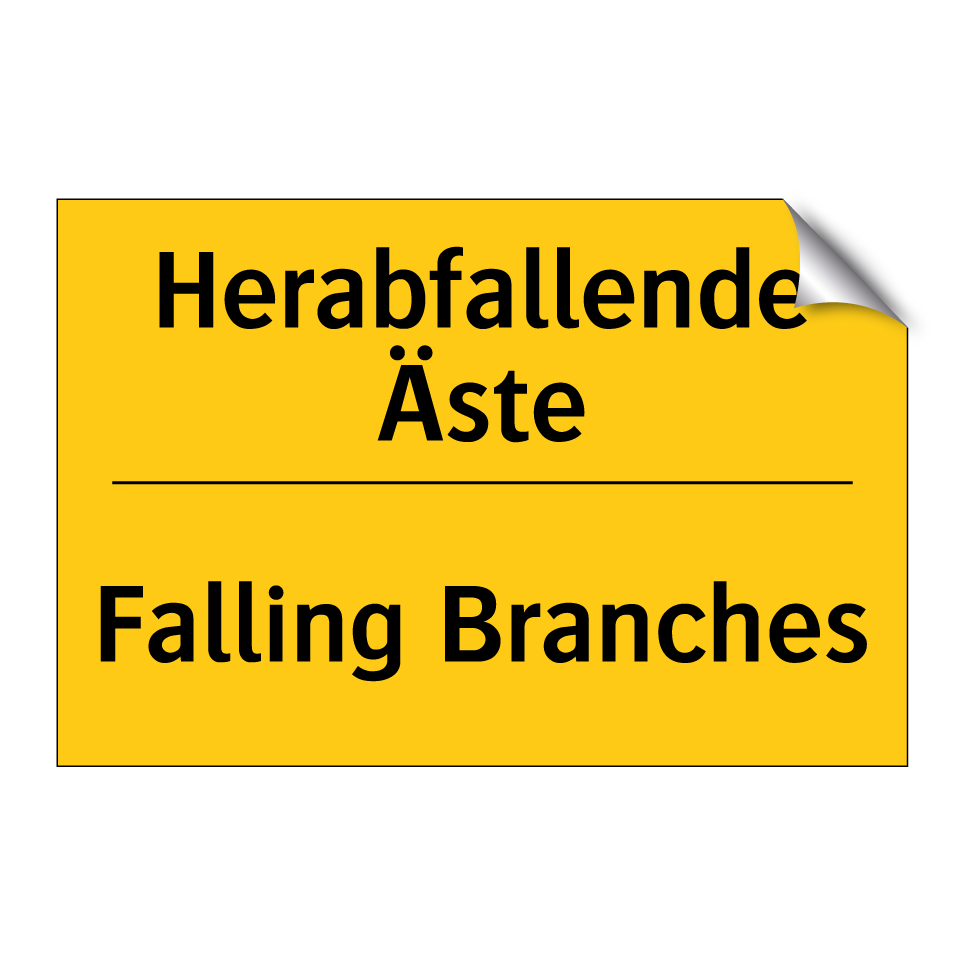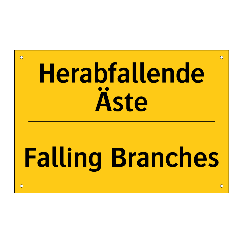 Zweisprachiges Warnschild mit deutschem Text Herabfallende Äste und englischem Text Falling Branches