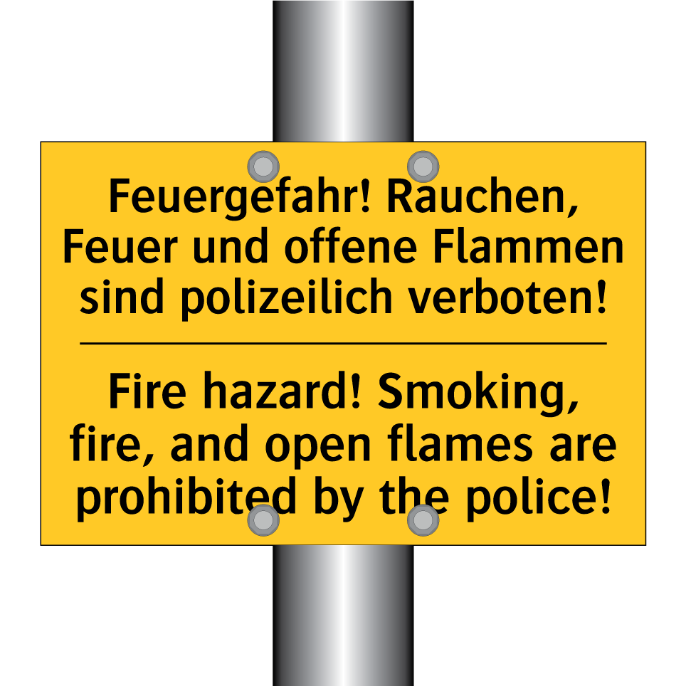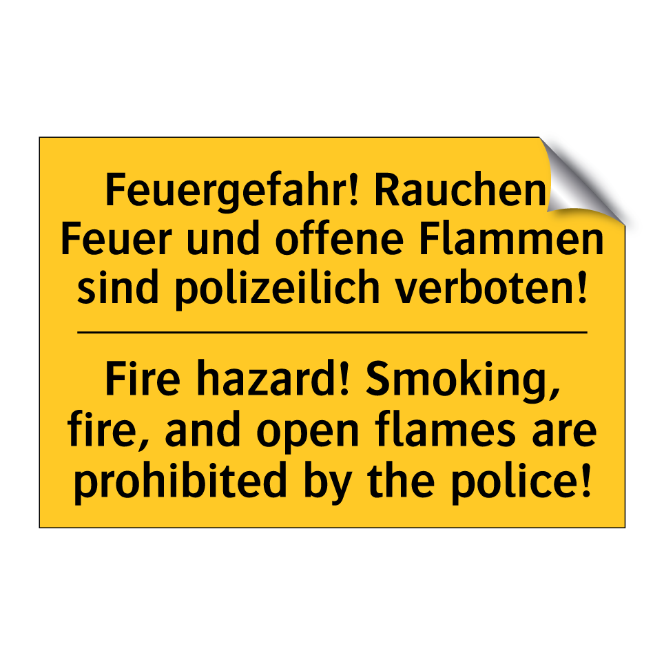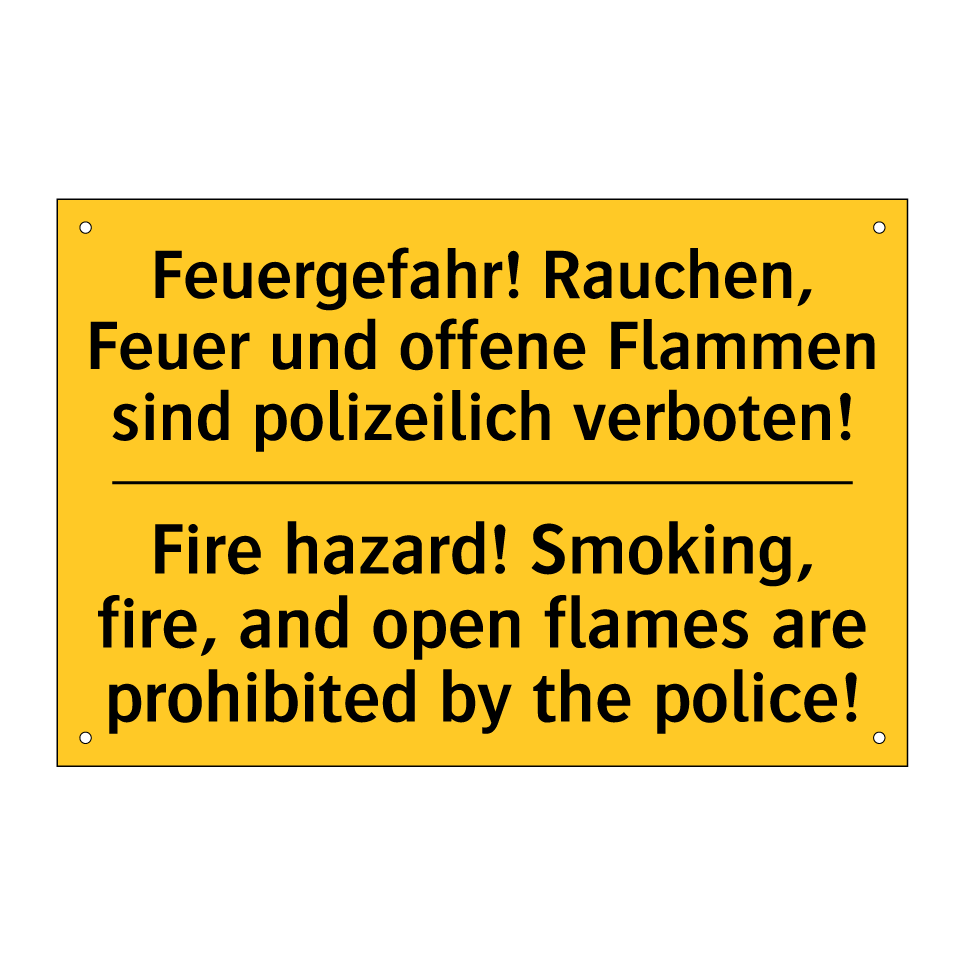 Zweisprachiges Warnschild mit deutschem Text Feuergefahr! Rauchen, Feuer und offene Flammen sind polizeilich verboten! und englischem Text Fire hazard! Smoking, fire, and open flames are prohibited by the police!