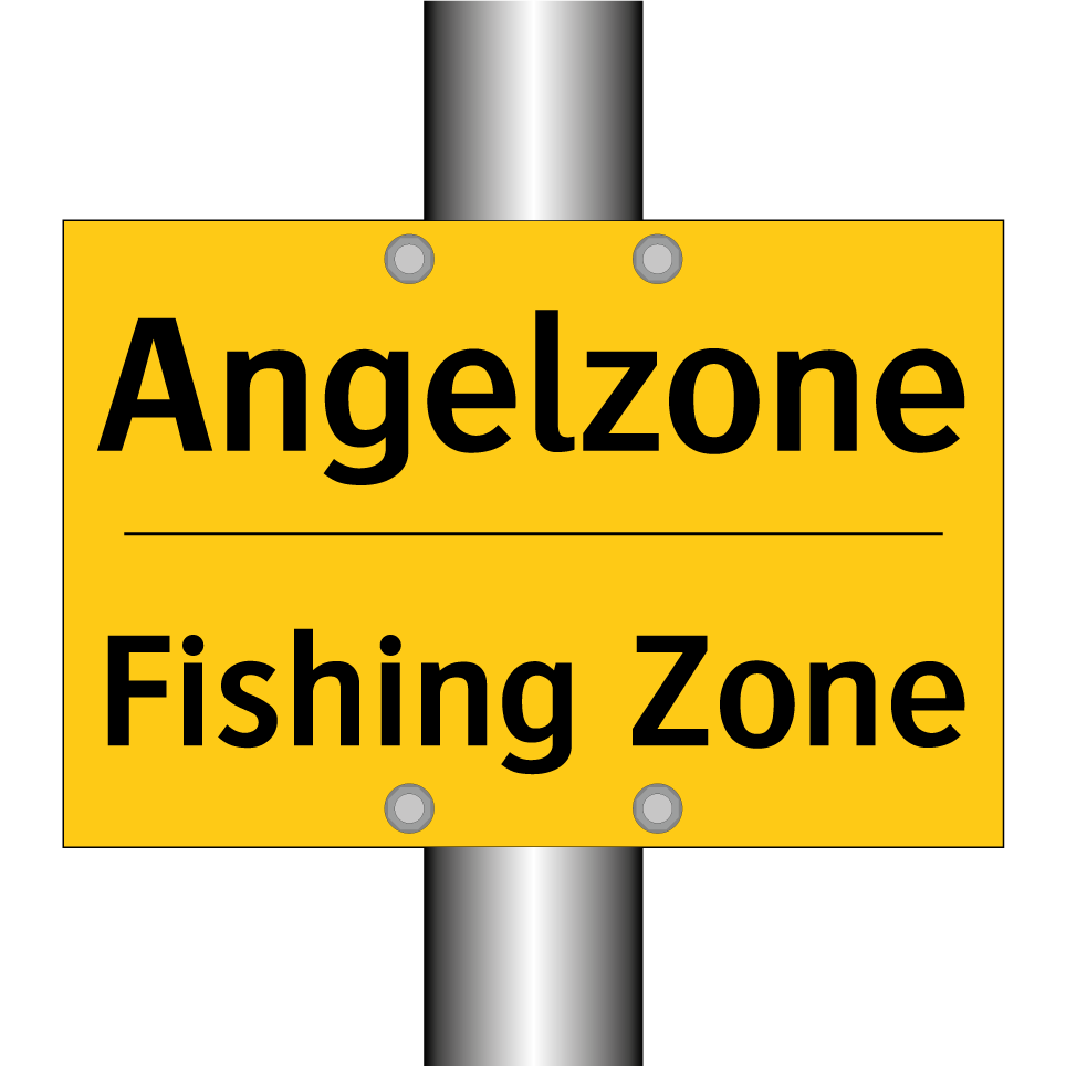 Zweisprachiges Warnschild mit deutschem Text Angelzone und englischem Text Fishing Zone