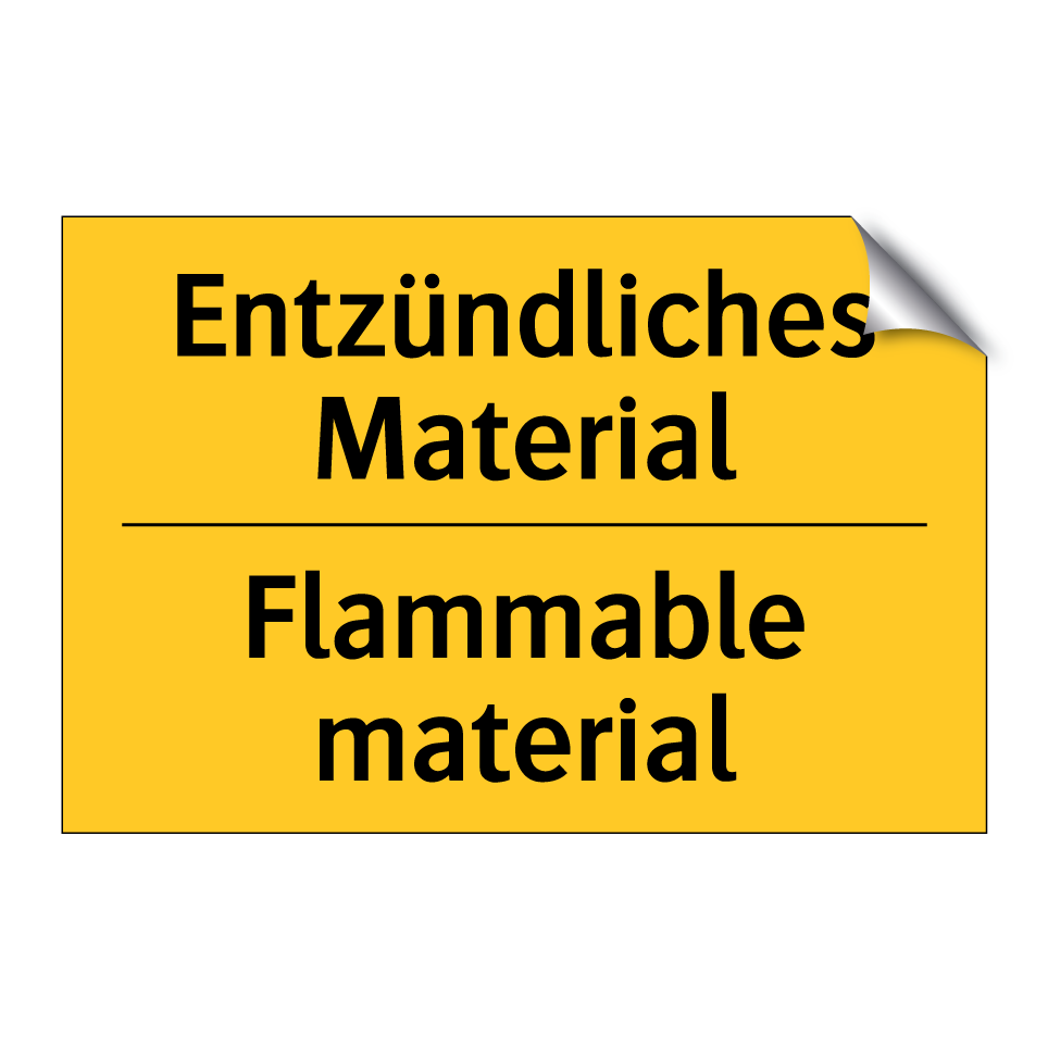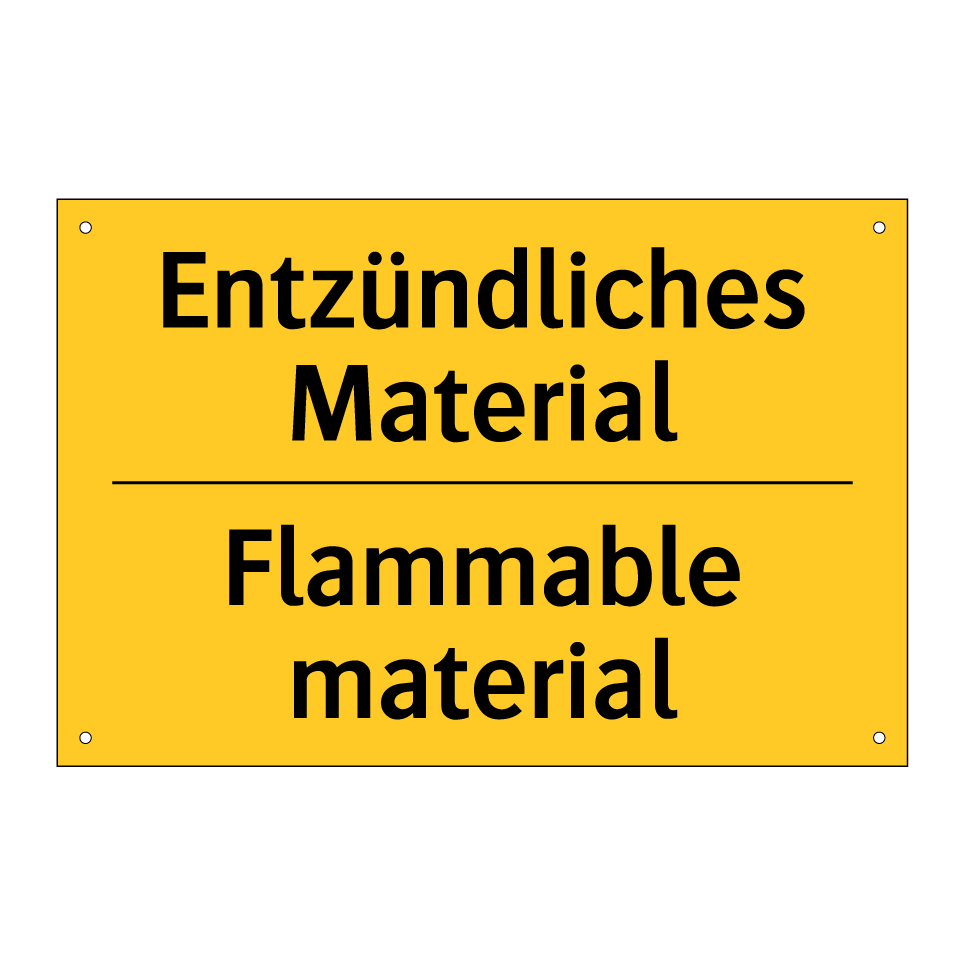 Zweisprachiges Warnschild mit deutschem Text Entzündliches Material und englischem Text Flammable material