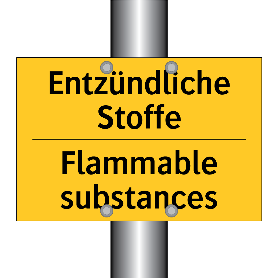 Zweisprachiges Warnschild mit deutschem Text Entzündliche Stoffe und englischem Text Flammable substances