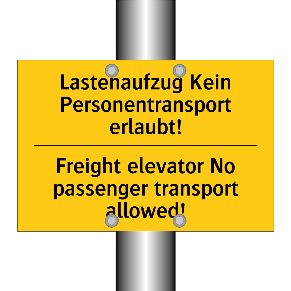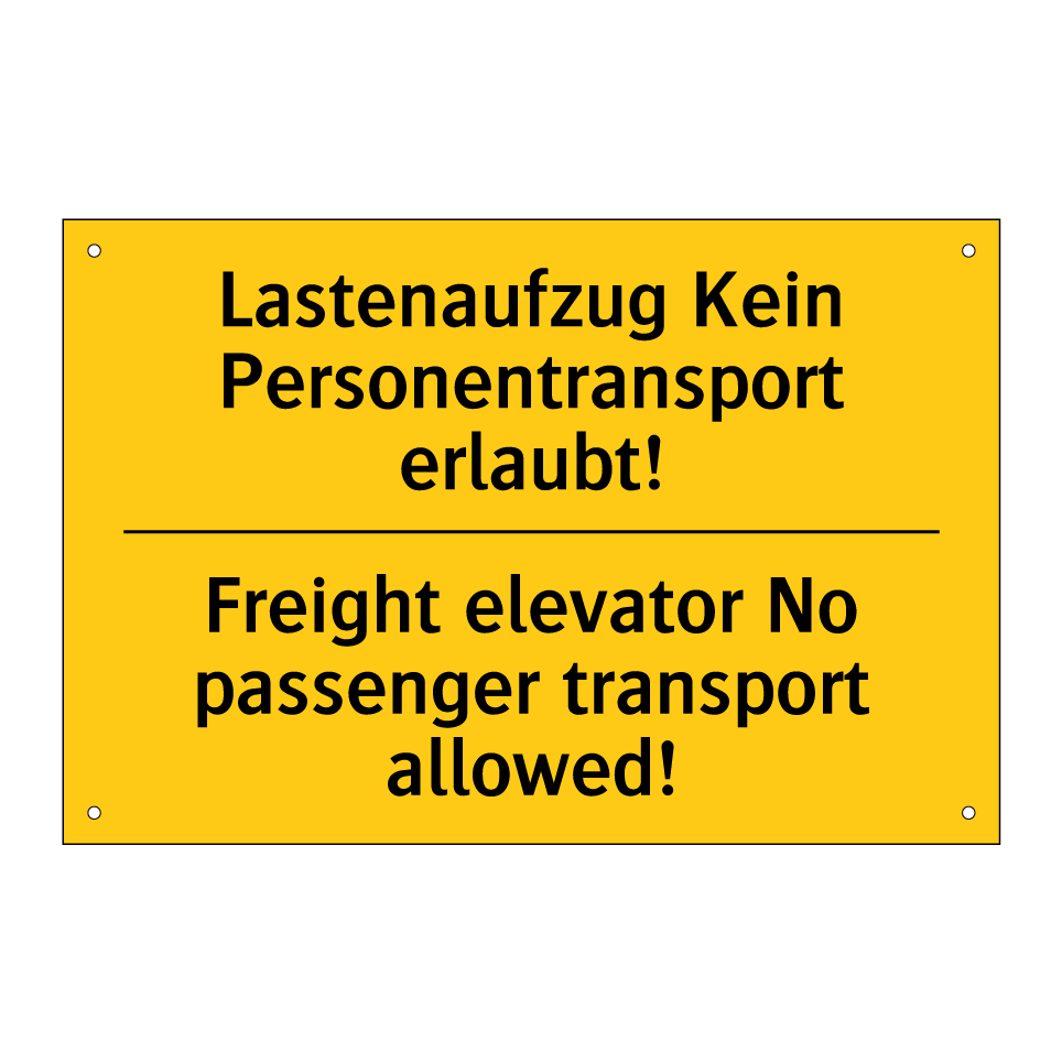 Zweisprachiges Warnschild mit deutschem Text Lastenaufzug Kein Personentransport erlaubt! und englischem Text Freight elevator No passenger transport allowed!