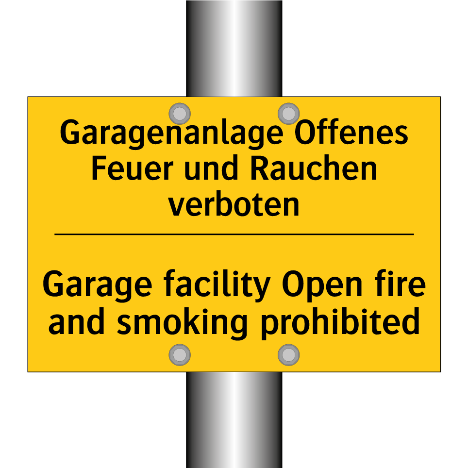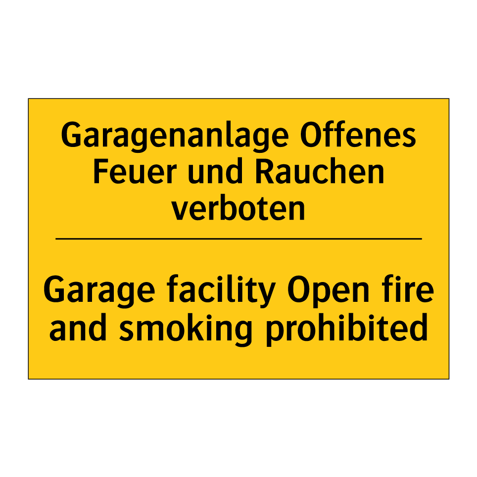 Zweisprachiges Warnschild mit deutschem Text Garagenanlage Offenes Feuer und Rauchen verboten und englischem Text Garage facility Open fire and smoking prohibited