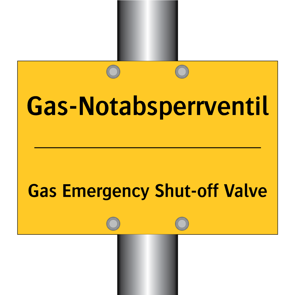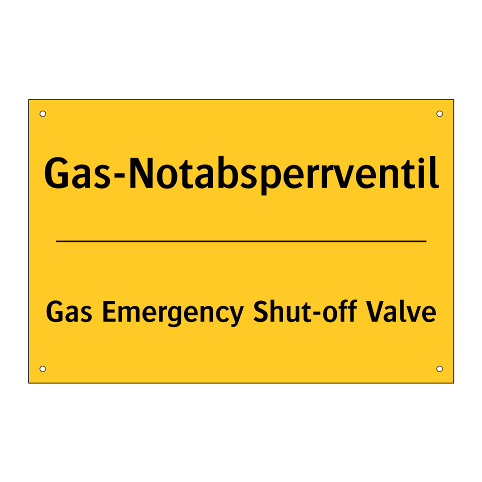 Zweisprachiges Warnschild mit deutschem Text Gas-Notabsperrventil und englischem Text Gas Emergency Shut-off Valve