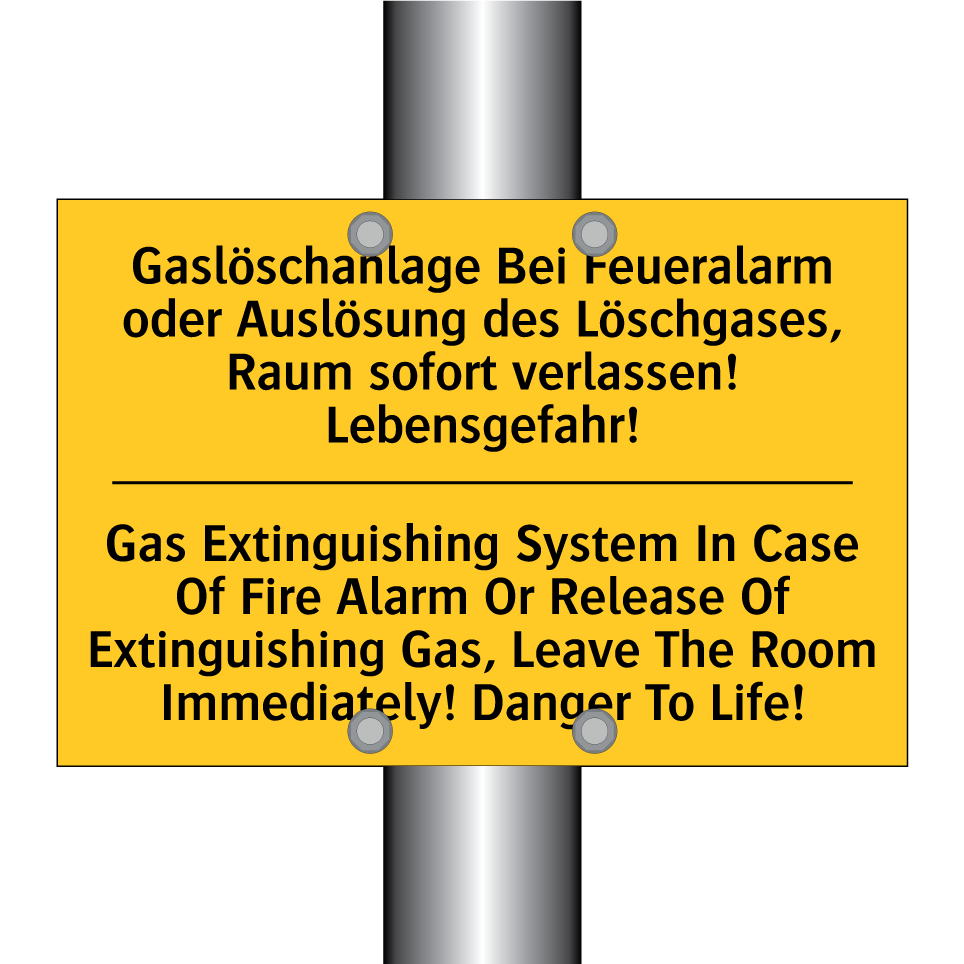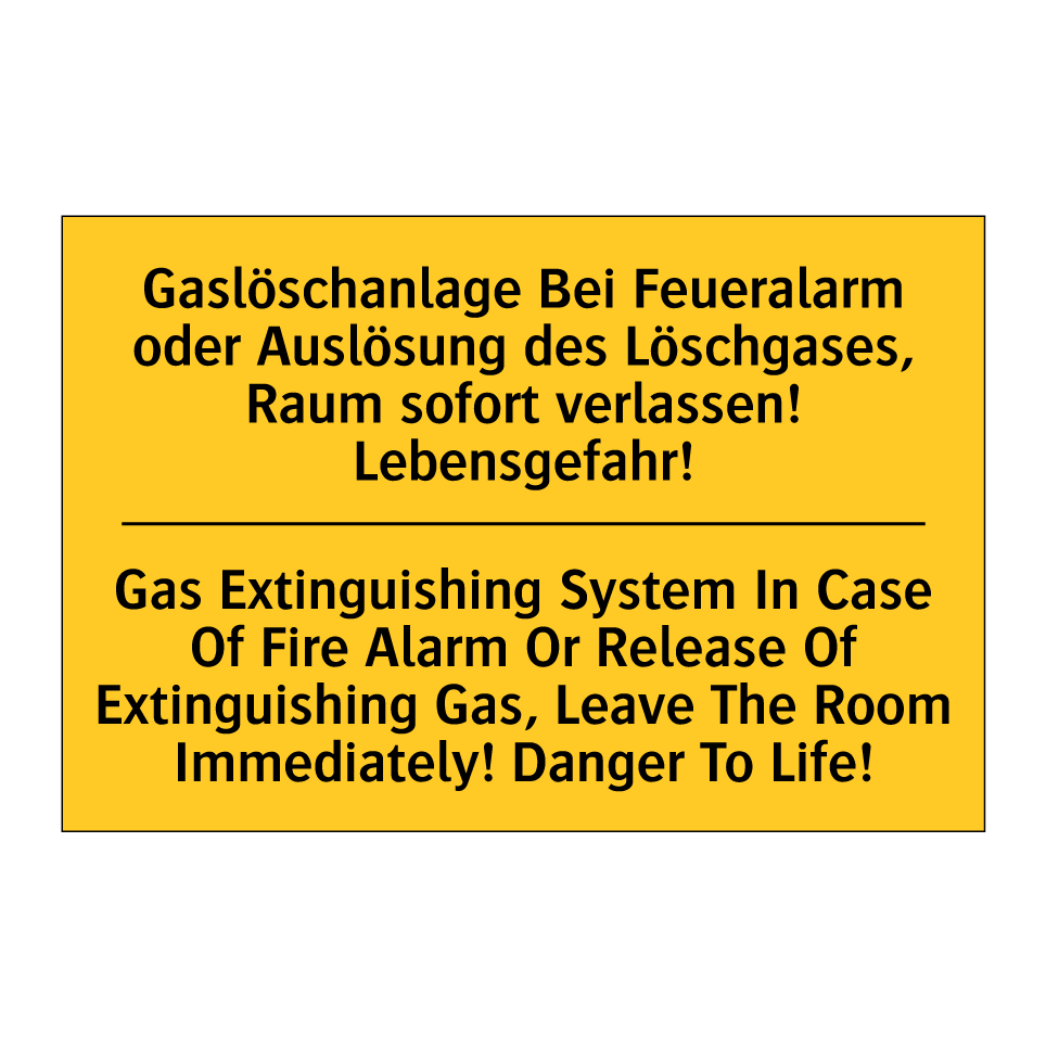 Zweisprachiges Warnschild mit deutschem Text Gaslöschanlage Bei Feueralarm oder Auslösung des Löschgases, Raum sofort verlassen! Lebensgefahr! und englischem Text Gas Extinguishing System In Case Of Fire Alarm Or Release Of Extinguishing Gas, Leave The Room Immediately! Danger To Life!