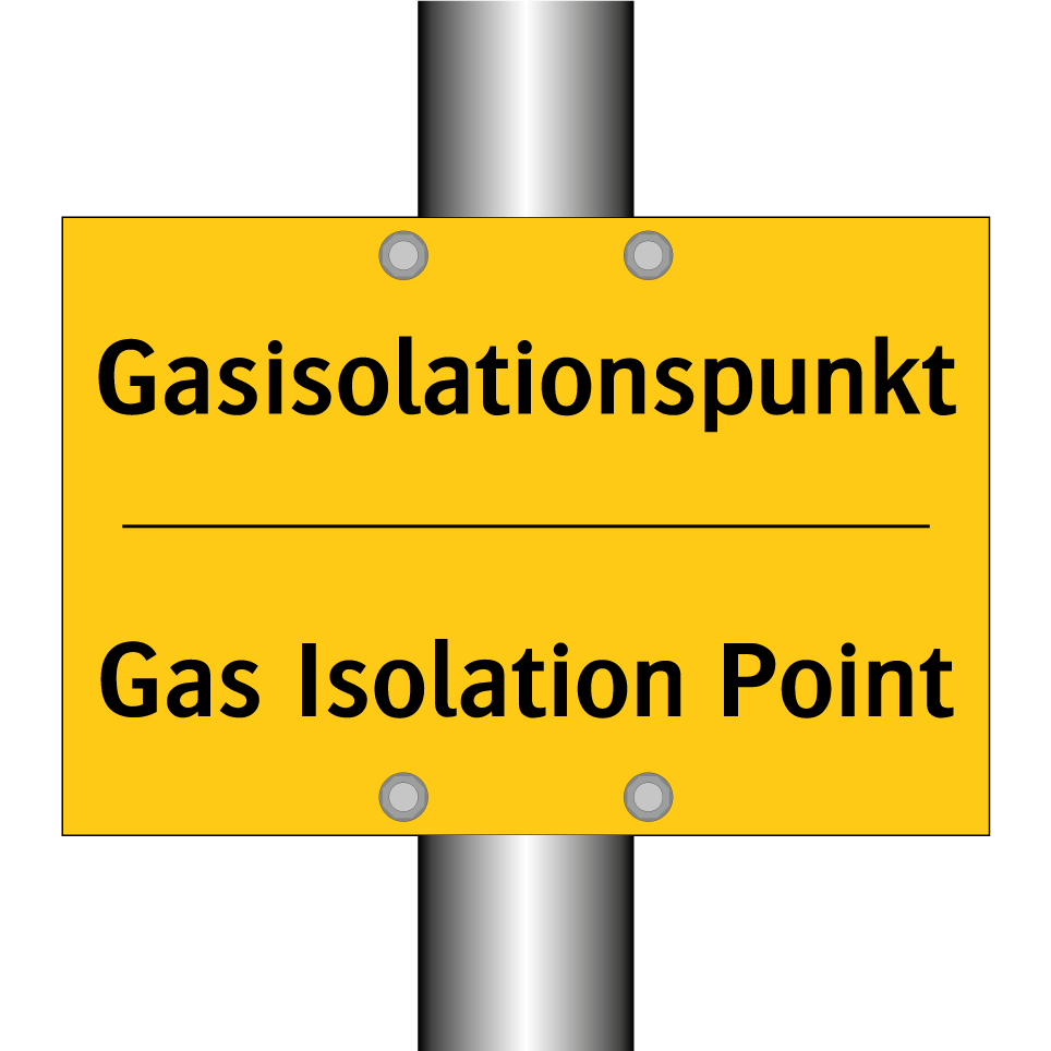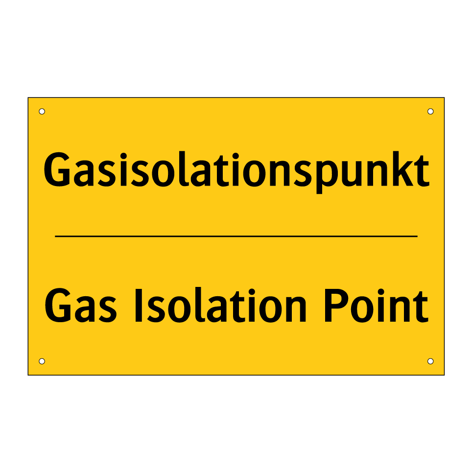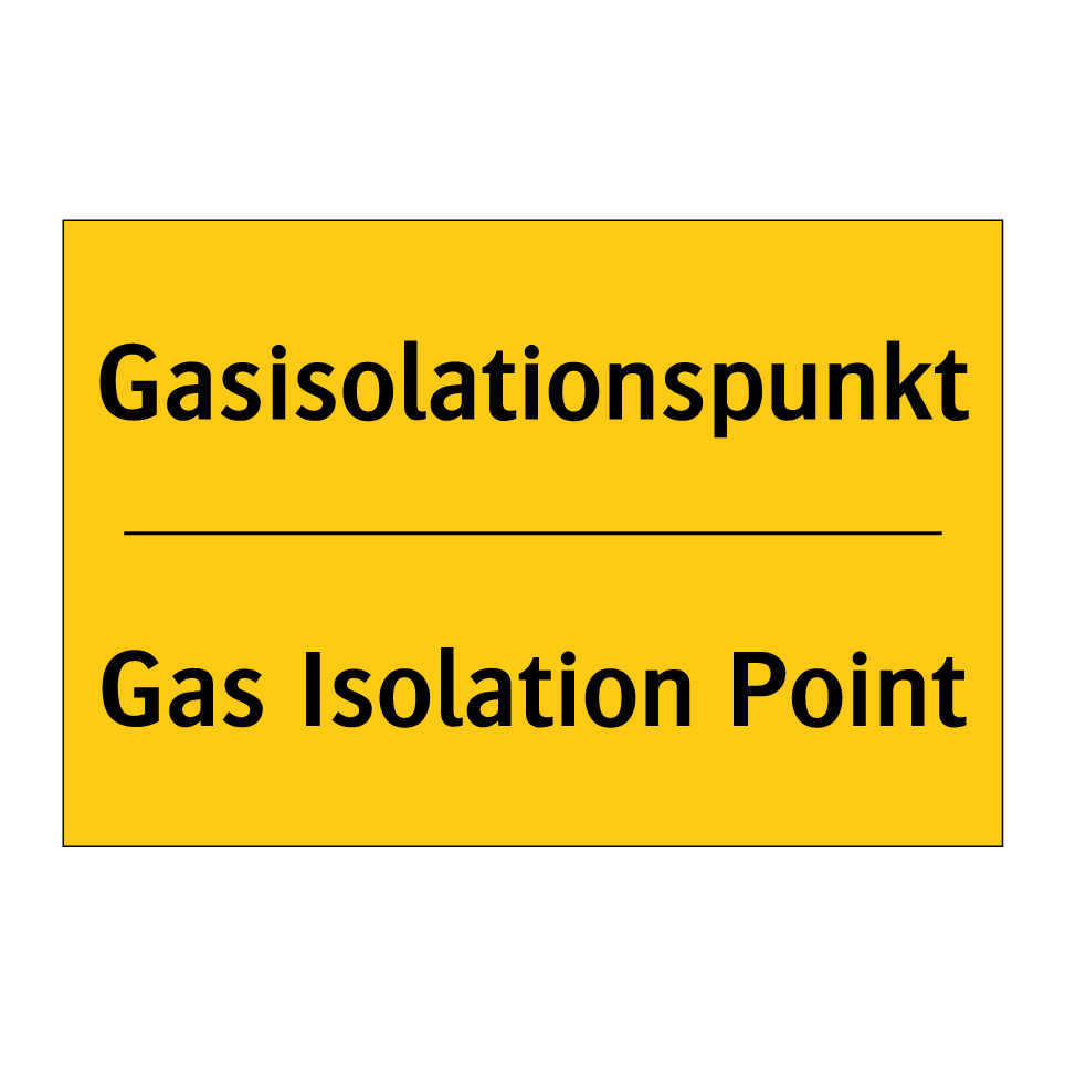Zweisprachiges Warnschild mit deutschem Text Gasisolationspunkt und englischem Text Gas Isolation Point