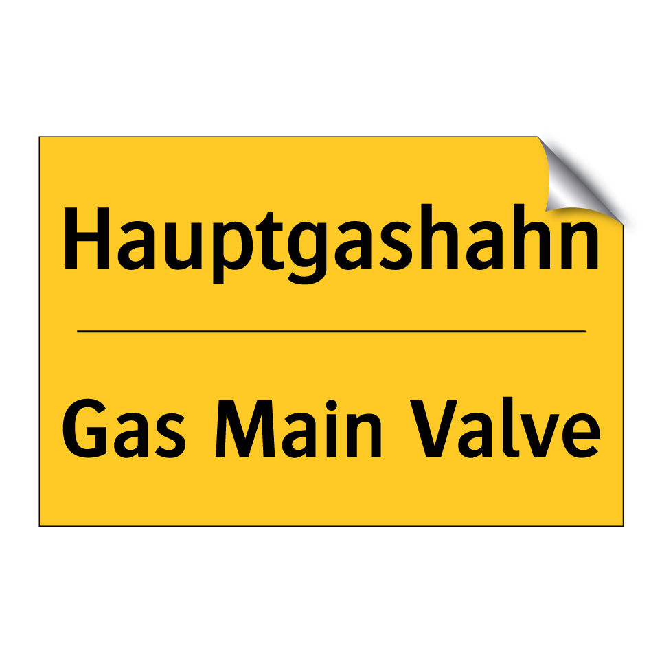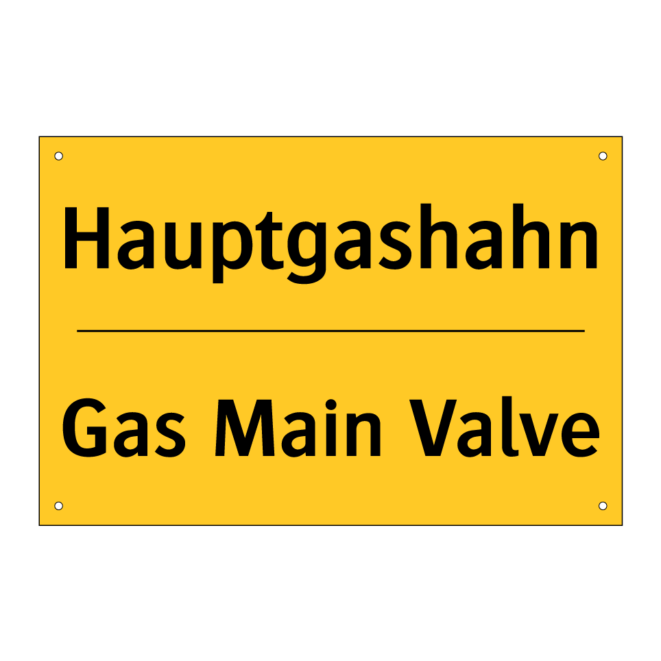 Zweisprachiges Warnschild mit deutschem Text Hauptgashahn und englischem Text Gas Main Valve