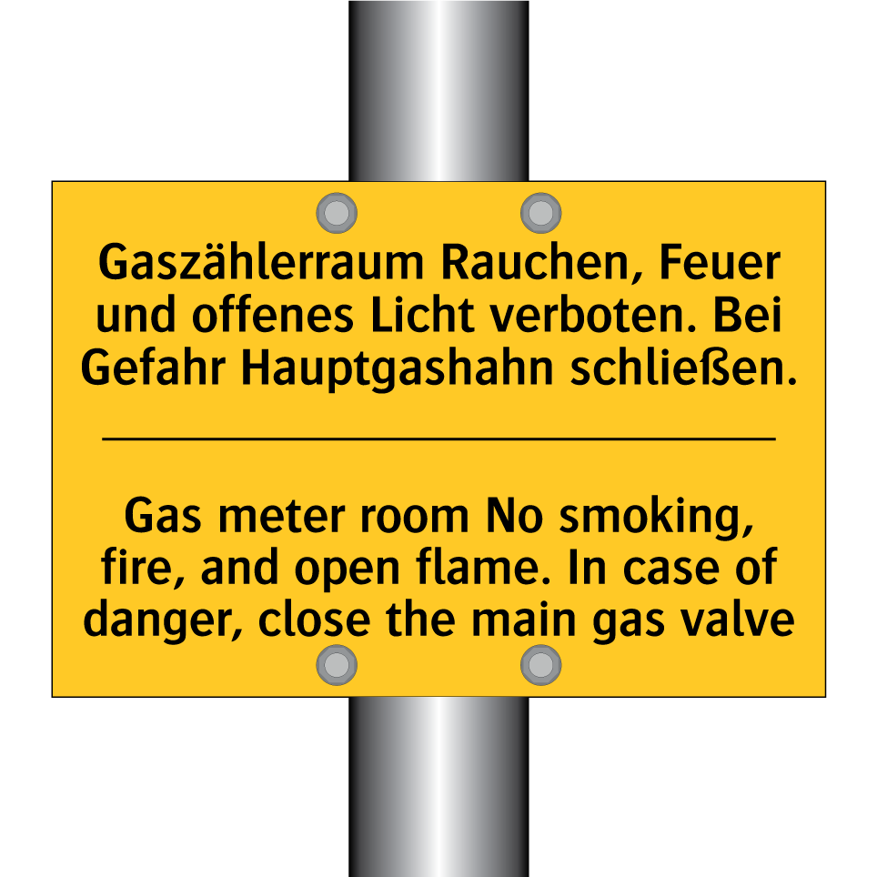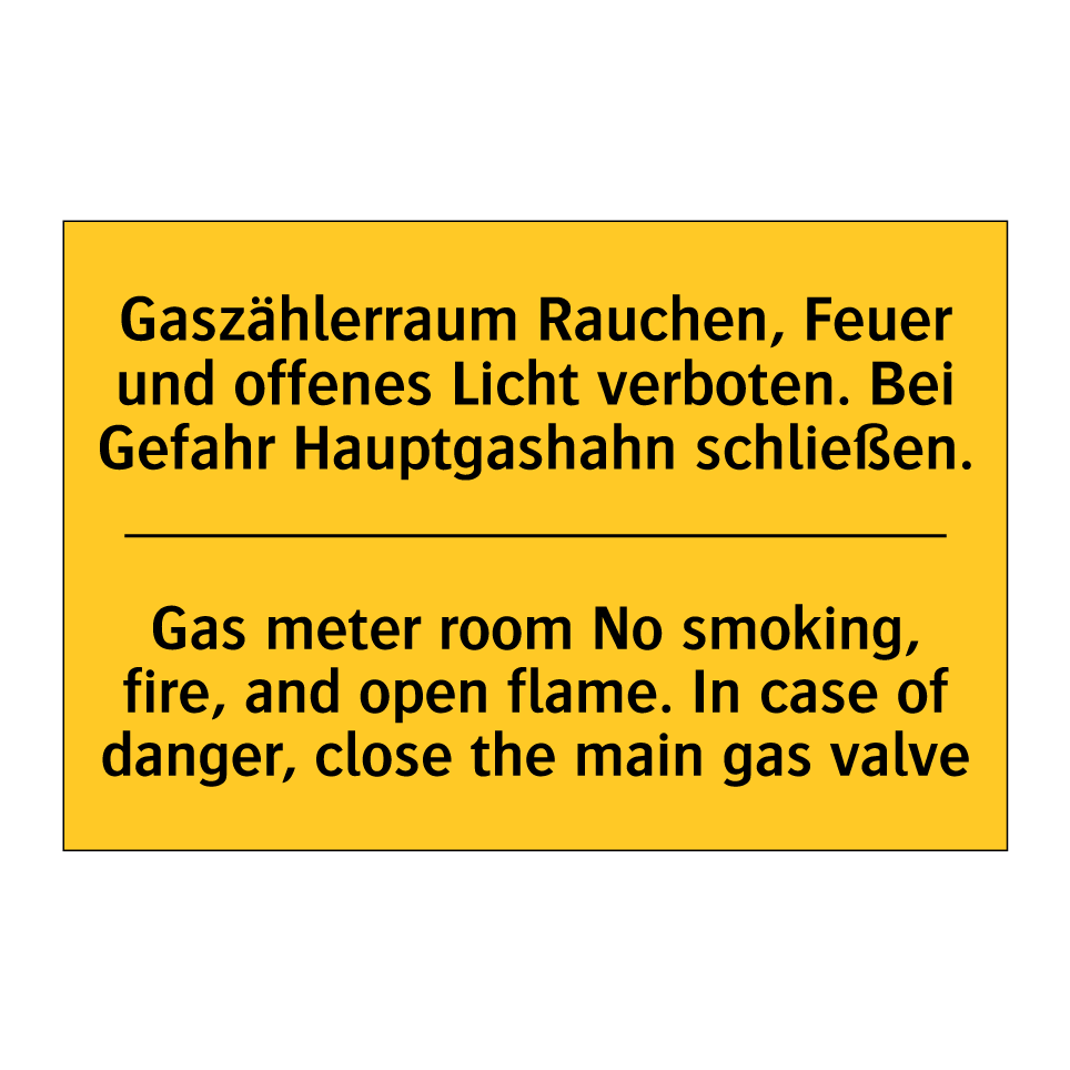 Zweisprachiges Warnschild mit deutschem Text Gaszählerraum Rauchen, Feuer und offenes Licht verboten. Bei Gefahr Hauptgashahn schließen. und englischem Text Gas meter room No smoking, fire, and open flame. In case of danger, close the main gas valve