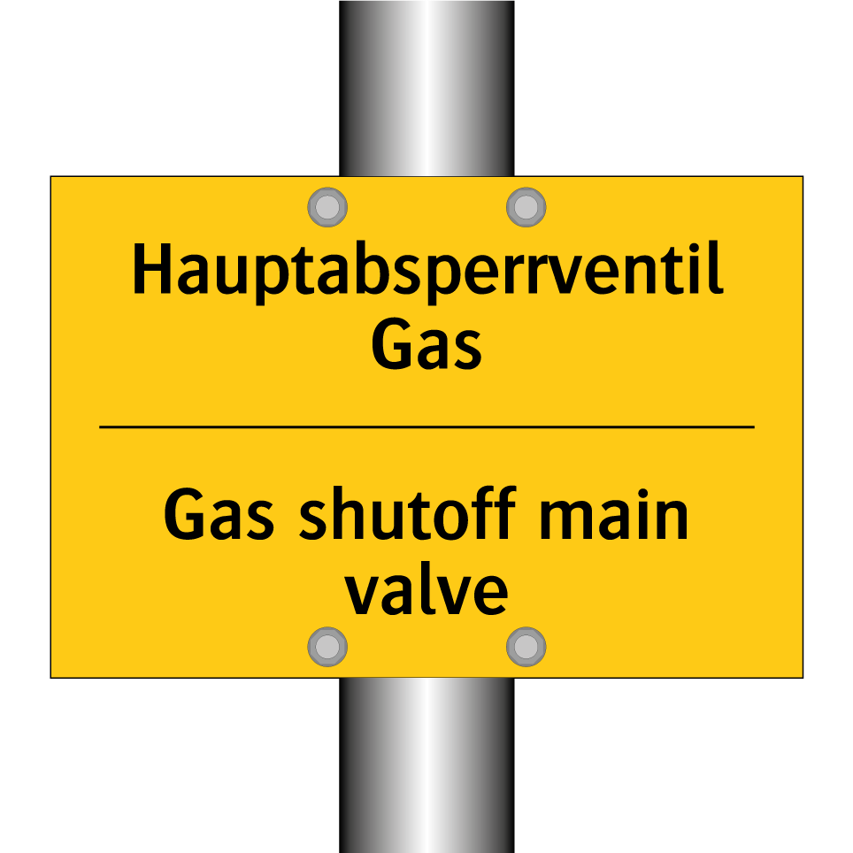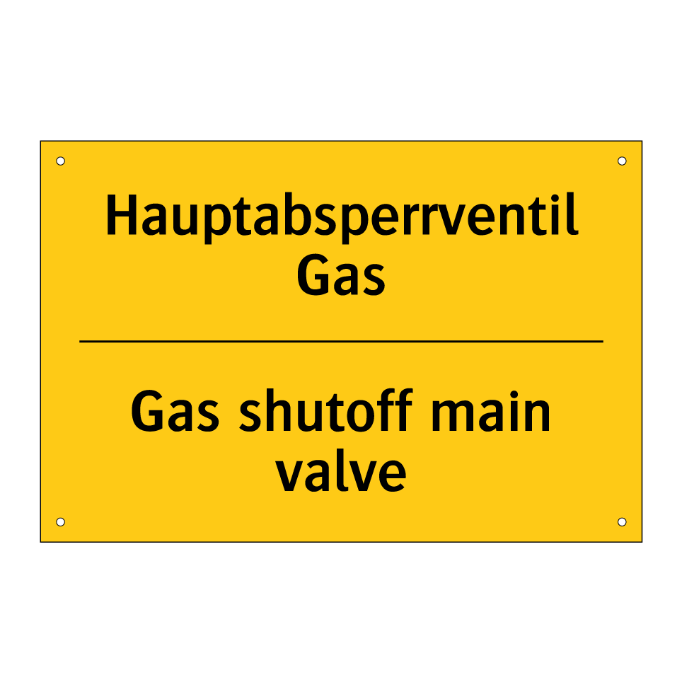 Zweisprachiges Warnschild mit deutschem Text Hauptabsperrventil Gas und englischem Text Gas shutoff main valve