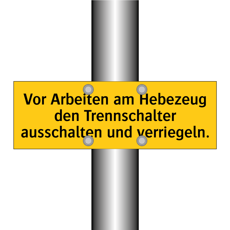 Warnschild mit dem Text Vor Arbeiten am Hebezeug den Trennschalter ausschalten und verriegeln.