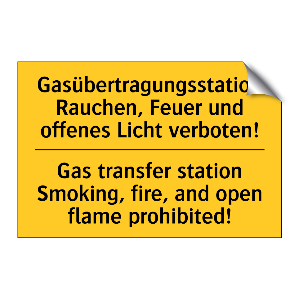Zweisprachiges Warnschild mit deutschem Text Gasübertragungsstation Rauchen, Feuer und offenes Licht verboten! und englischem Text Gas transfer station Smoking, fire, and open flame prohibited!